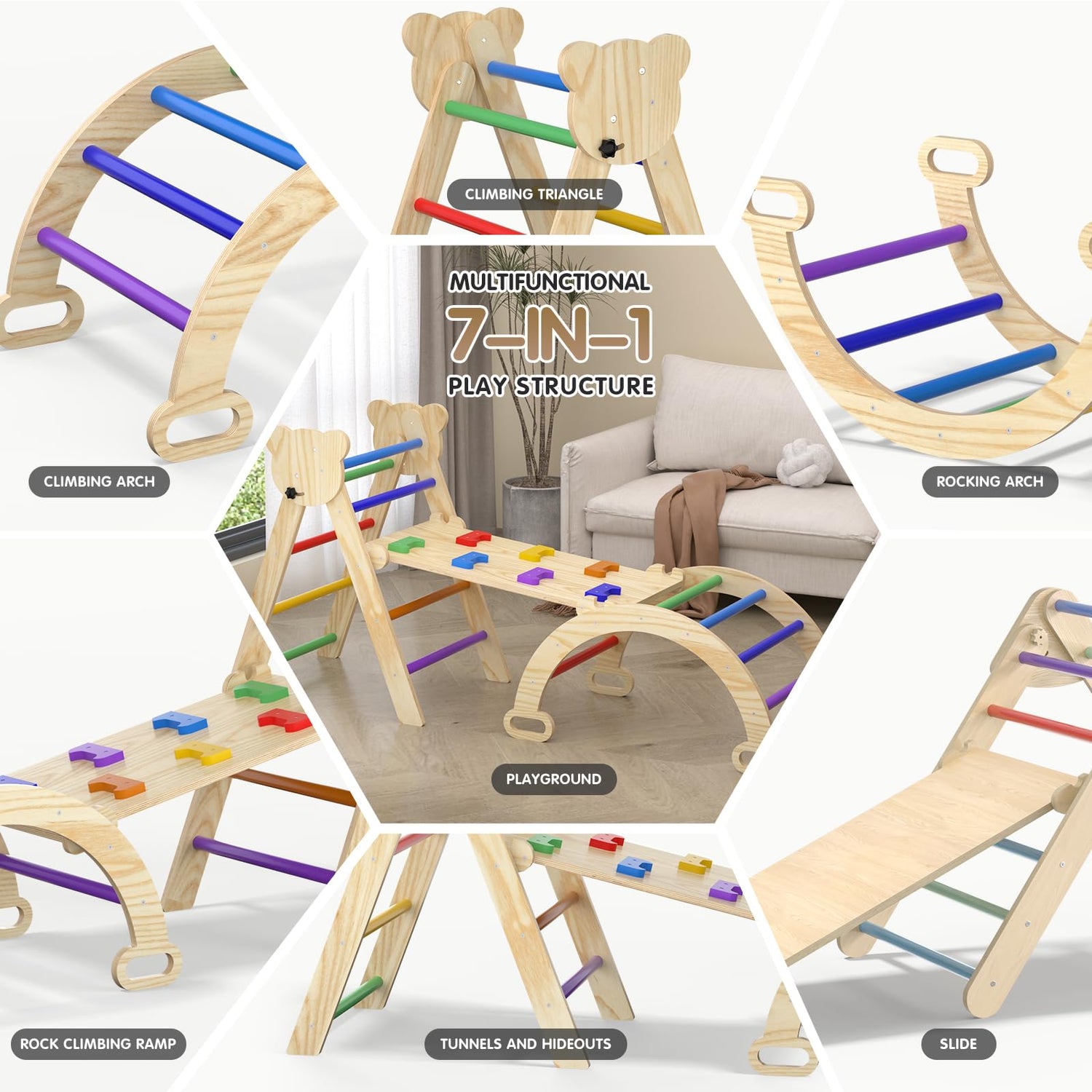 7 in 1 Montessori Pikler Triangle Set, Foldable Wooden Pickler-3 Piece Baby Climbing Gym Toddler Climbing Toys Indoor with Arch, Ramp, Ladder