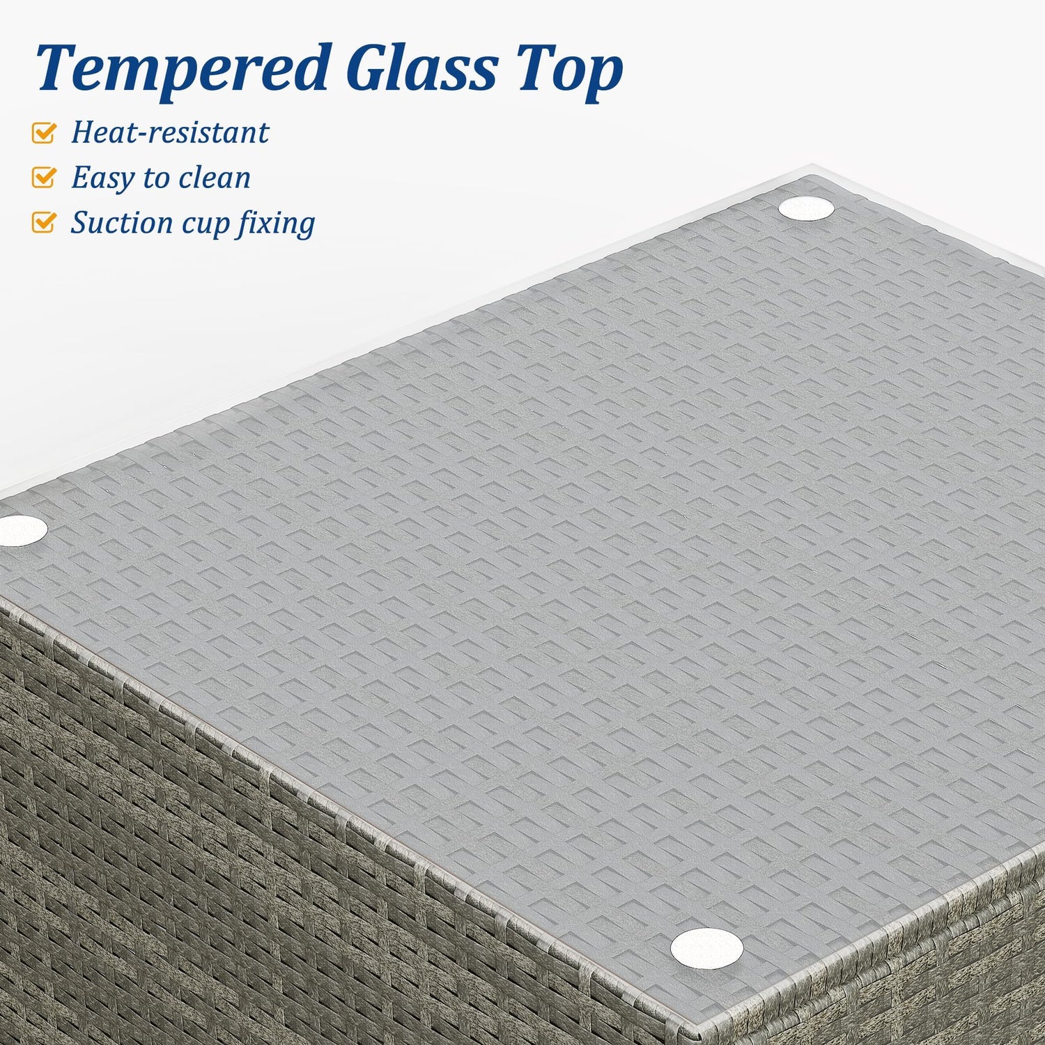 - Glass Coffee Table: Our outdoor furniture set includes a sturdy tempered glass coffee table. Held in place by suction cups, this tabletop is easy to clean and creates a stylish and functional centrepiece for your outdoor gatherings.