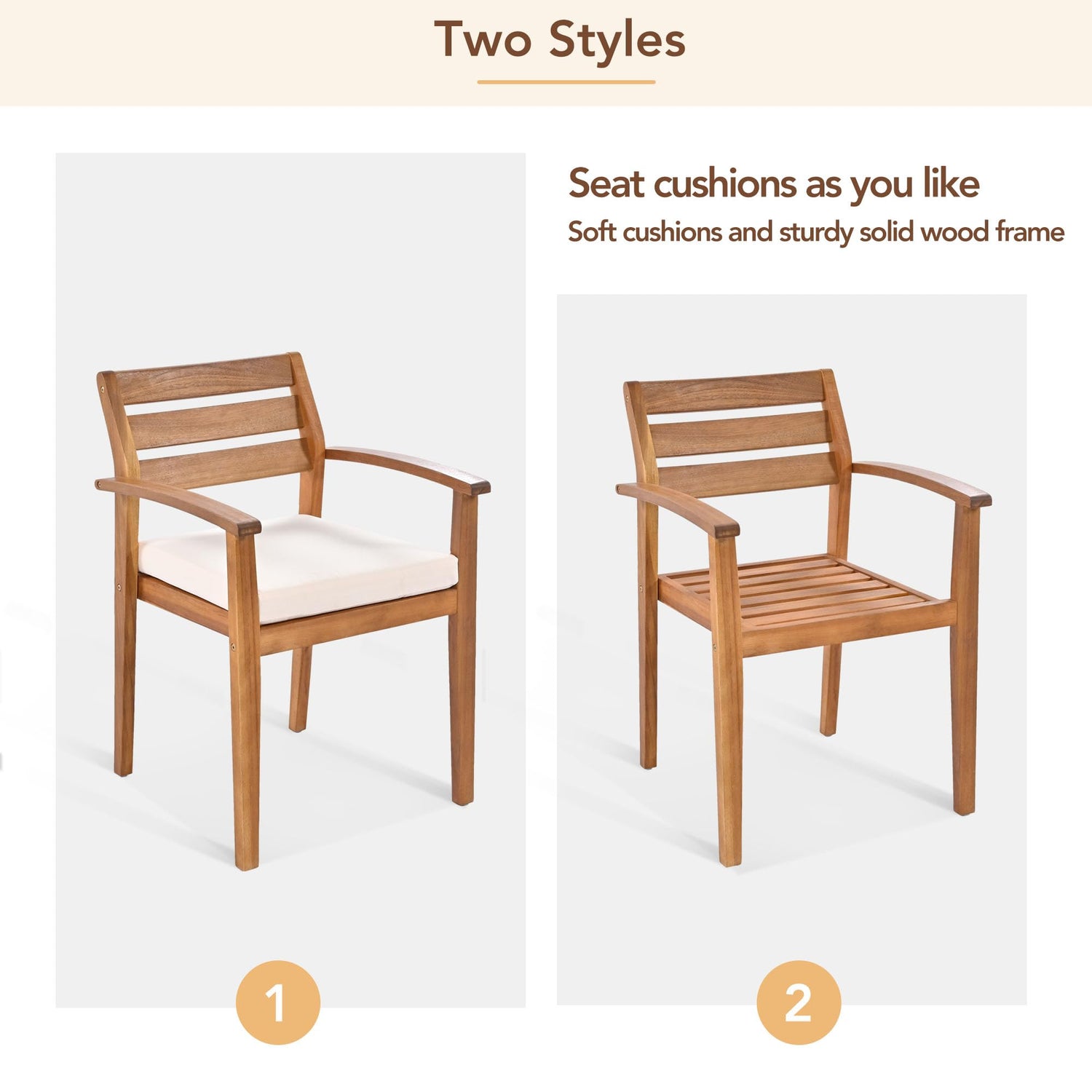 Details: With Cushions: The chairs in the set are made of 100% acacia wood, ensuring the chair is stable and strong for any size person sitting. Equipped with beige removable cushions, which add additional comfy and can be easily washed.