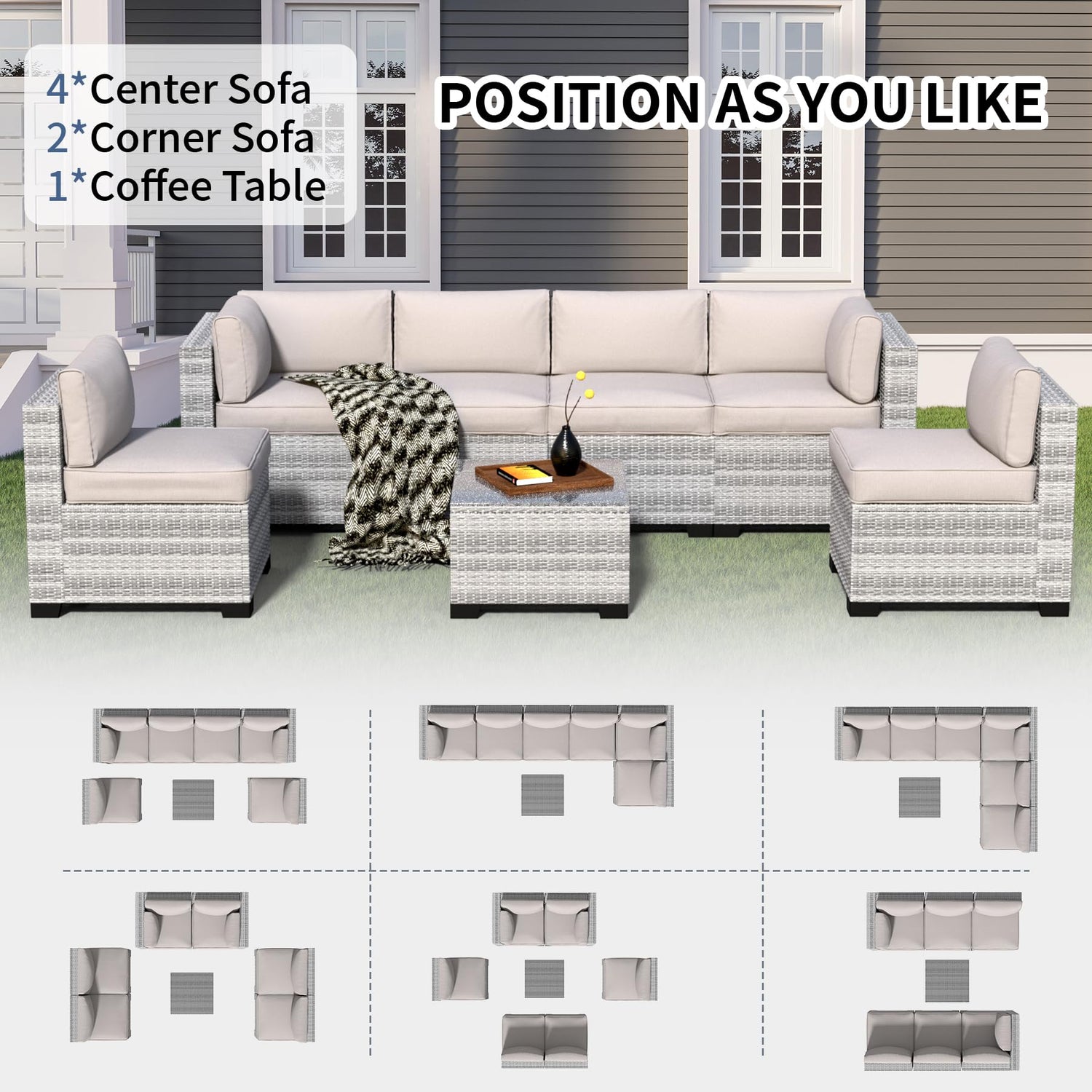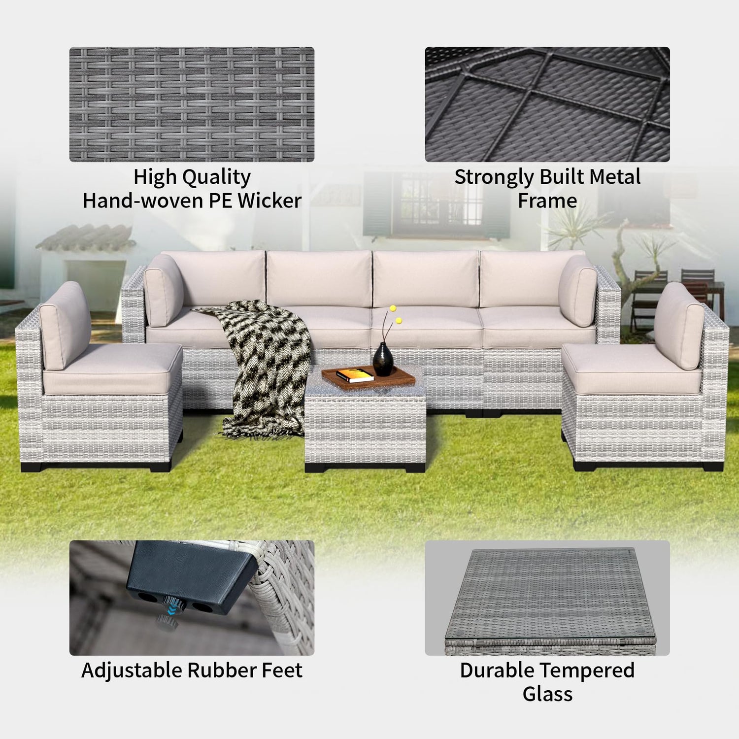 7-Piece Outdoor Sectional Patio Furniture Set, All-Weather Wicker Rattan Sofa w/Thick Washable Cushions & Tempered Glass Table, Perfect for Garden, Poolside, Backyard (7, Graywhite&Offwhite)