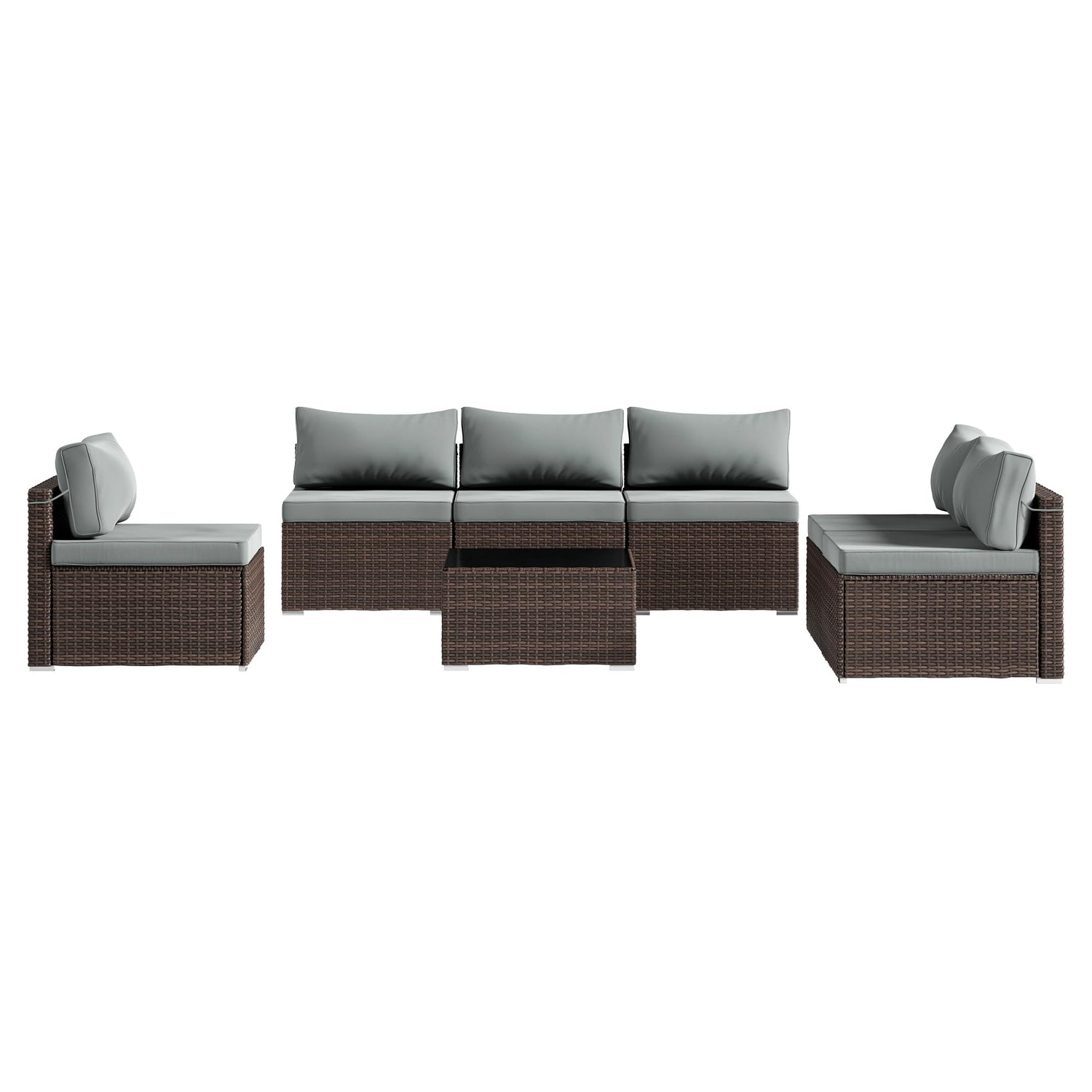 7 Piece Patio Furniture Set, Outdoor Wicker Patio Sofa Set, PE Rattan Sectional Couch with Glass Table and Grey Cushions, All-Weather 7 Piece Outdoor Patio Furniture Sets, Brown