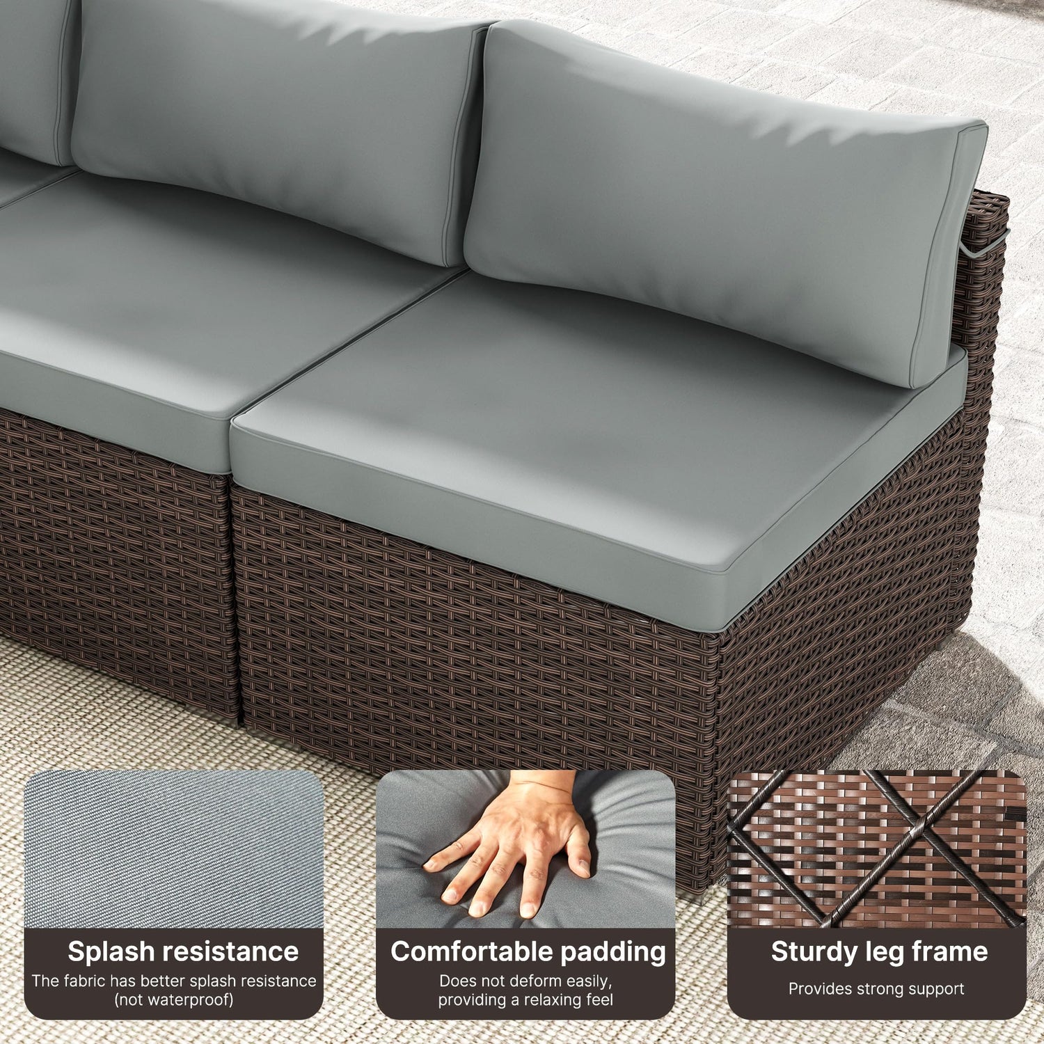 - 【Upgraded Comfort with Thick Cushions】 The outdoor sectional sofa comes with 3.5-inch thick cushions filled with soft PP cotton for maximum comfort. Tied with secure straps, the cushions stay in place even in windy conditions. Pillows are included for enhanced relaxation in your patio sofa set.