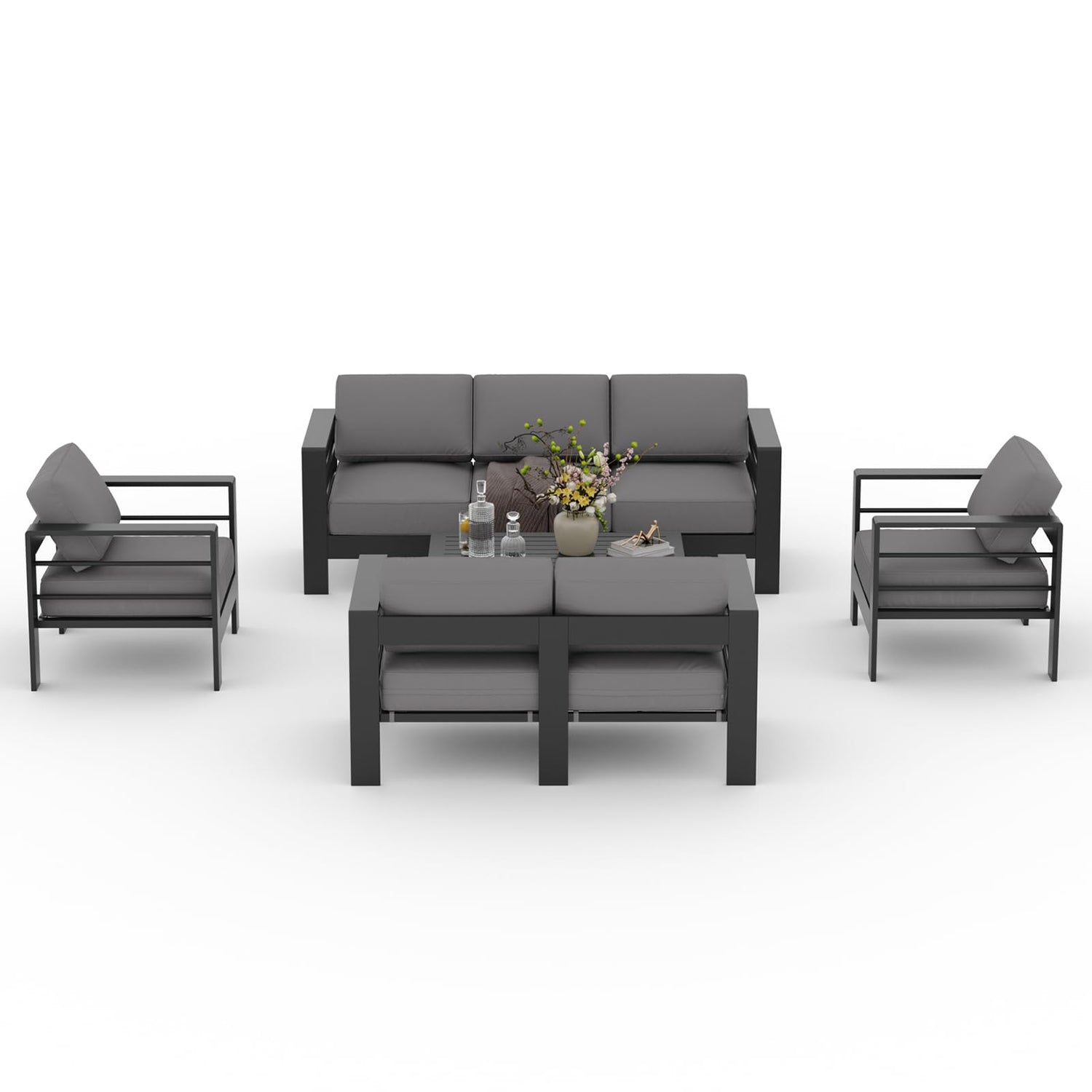 7 Seats Aluminum Patio Furniture Set, 5 PCS Outdoor Sectional Conversation Set with 4" Wide Armrest, Backyard Sectional Sofa Set with Coffee Table & Thick Cushions, Grey