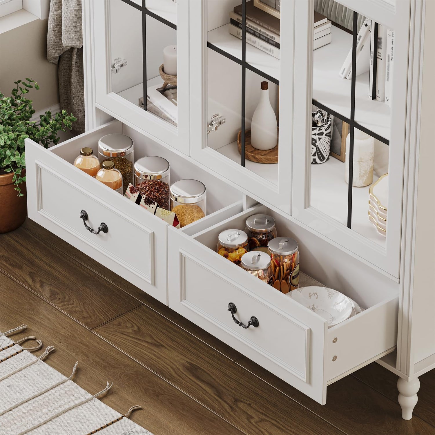 70.8'' Tall Arched Kitchen Pantry Cabinet, Large Farmhouse Storage Cabinet with Glass Doors, Display Case, Wood Bookshelf with 2 Drawers & Adjustable Shelves, Kitchen Pantry for Living Room, White