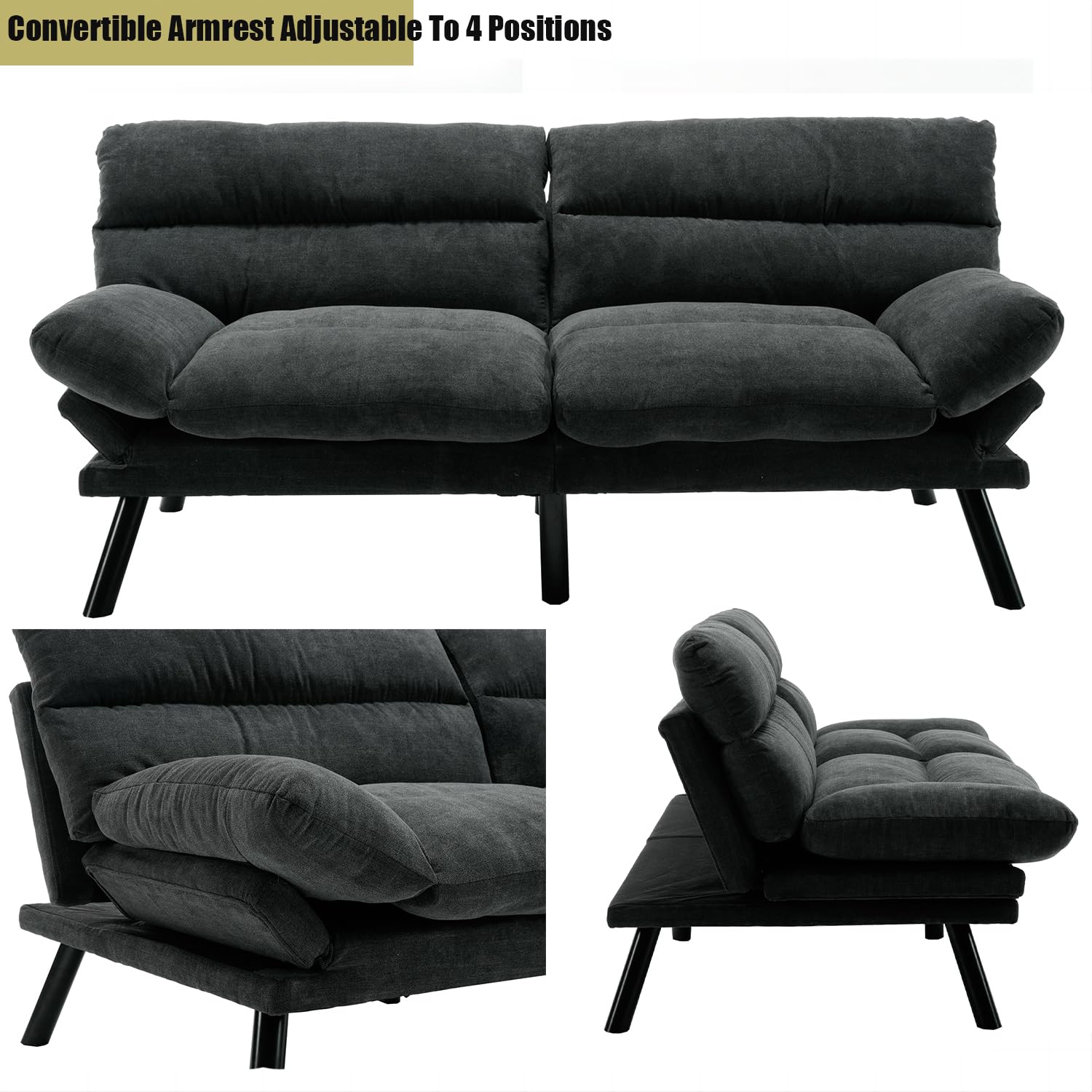 - 💖[Convertible & Multifunctional Futon Couch]Designed to take any room from day-to-night, a split seat and back design with fold-up arms quickly and easily convert the futon from a sofa to lying flat in a flash(upright, slightly reclined, flat). It can be used as a sofa when entertaining guests, and as a bed when you want to rest. One thing with multiple uses is more in line with the needs of modern life.