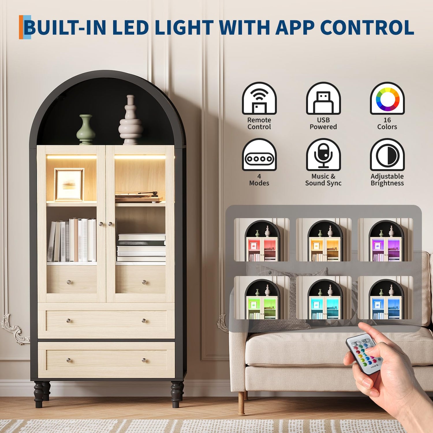 70 in Tall Arched Storage Display Cabinet, Kitchen Pantry Cabinet with LED Lights, Adjustable Shelf, 3 Drawers and Tempered Glass Doors, Boho Arch Bookshelf for Kitchen Dining Living Room- Black & Oak