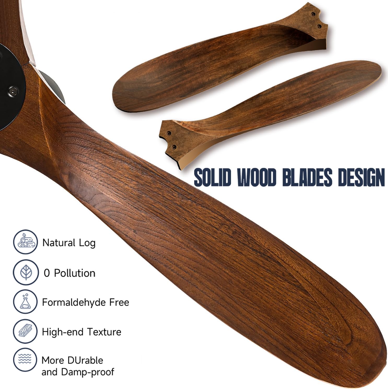 - SOLID WOOD FAN BLADES:Large airflow propeller ceiling fan with 100% natural solid wood blades, natural wood grain. Crafted from over 20-year-old walnut trees, avoids the formaldehyde pollution of industrial synthetic fan blades, With an aerodynamic design,moves Max 9660 CFM of airflow all the blades have gone through hundreds of professional balanced tests to ensure the 70 inch large ceiling fan spins stably