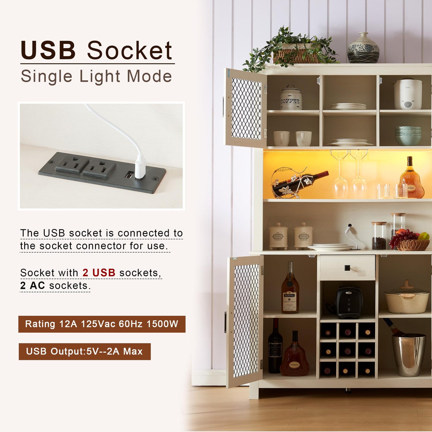Details: Kitchen storage cabinets feature distinct open and closed spaces that efficiently accommodate a variety of items, ensuring you have easy access to your essentials.This farmhouse coffee bar cabinet features 2 sets of black wine glass racks and 9 bottle wine racks, allowing you to store wine and display beautiful wine glasses. If you're looking for the perfect addition to your furniture collection, this cabinet is an inspiring choice that will look great in your living room or dining room.
