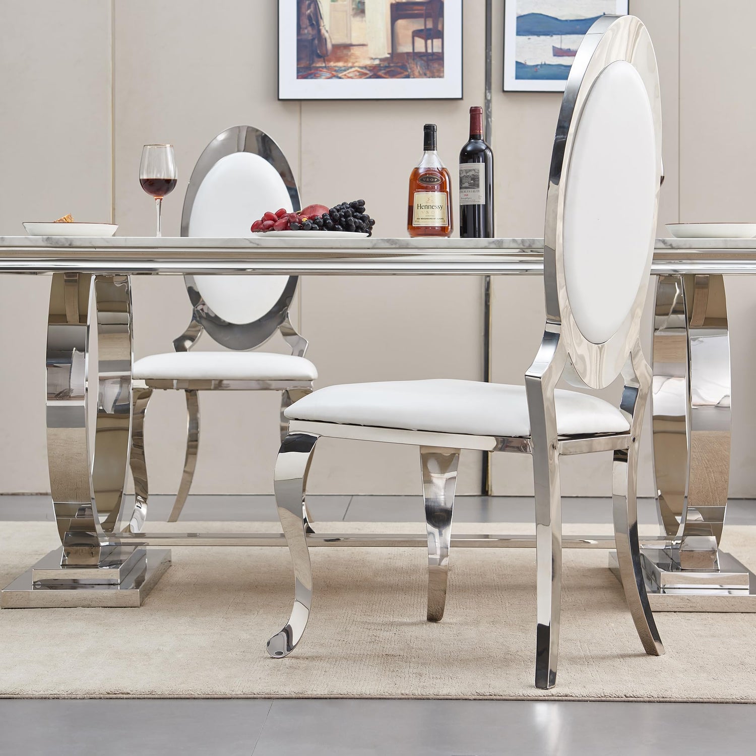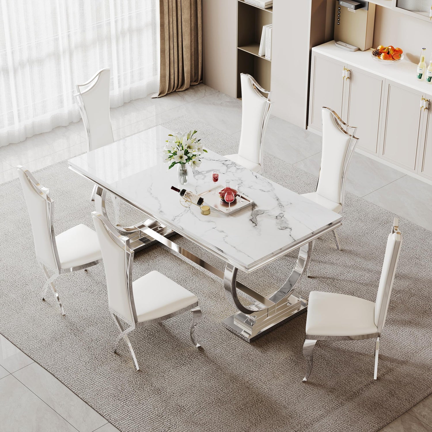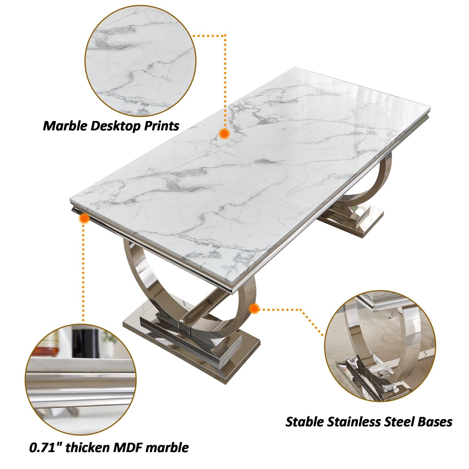 - 【Modern Rectangular Dining Table】- The combination of white faux marble texture top and mirrored finish stainless steel legs creates modern aesthetics and a glamorous visual effect. A perfect table to bring the elegance and avant-garde style to your kitchen, living room, or dining room.