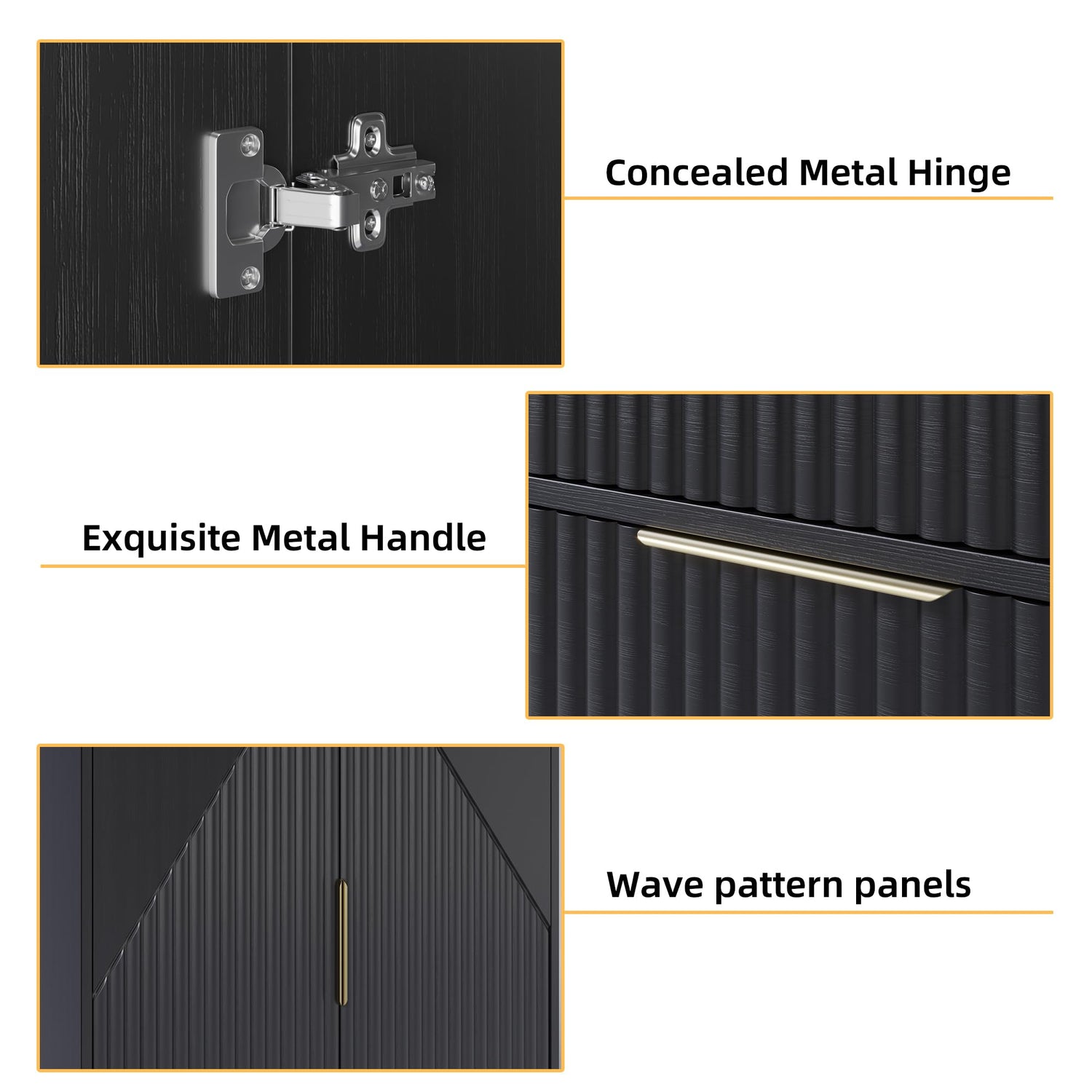 - 【Modern Armoire Wardrobe Closet】 Black wood grain finish of the Wardrobe and delicate edge banding give it a modern and elegant look. This wooden wardrobe is simple, it combines wave panels with gold handles to create luxury charm.This large wardrobe matches well with various house decors. The clean lines and elegant finishes create a sophisticated look, adding a touch of class to your living space. This wooden wardrobe will be a prefect addition to your home. Perfectly with many different house decors.