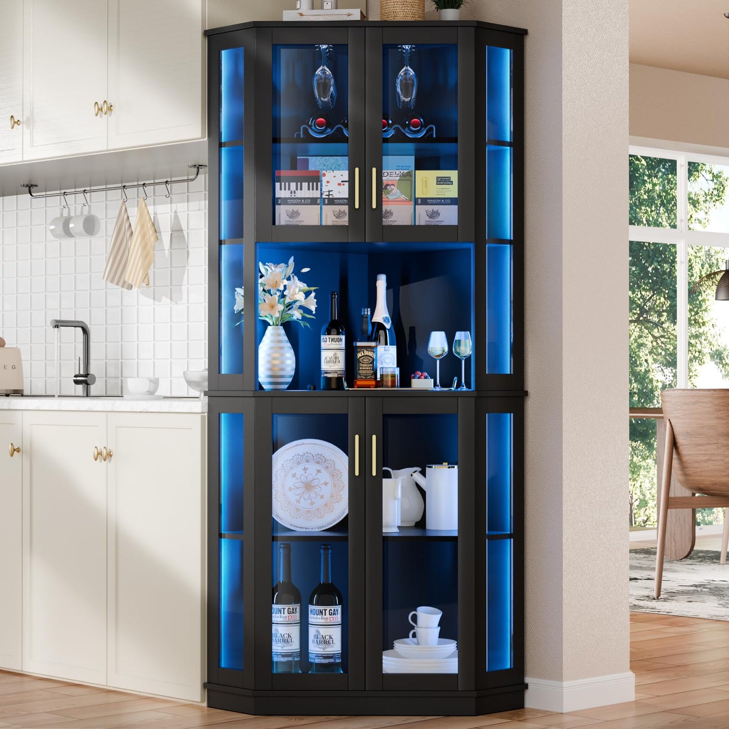 71'' Corner Wine Bar Cabinet with LED Lights,5-Tier Tall Home Liquor Coffee Bar Cabinet W with Tempered Glass Door & Glasses Rack, Alcohol Cabinet Storage Hutch for Kitchen, Living Room, Dining Room