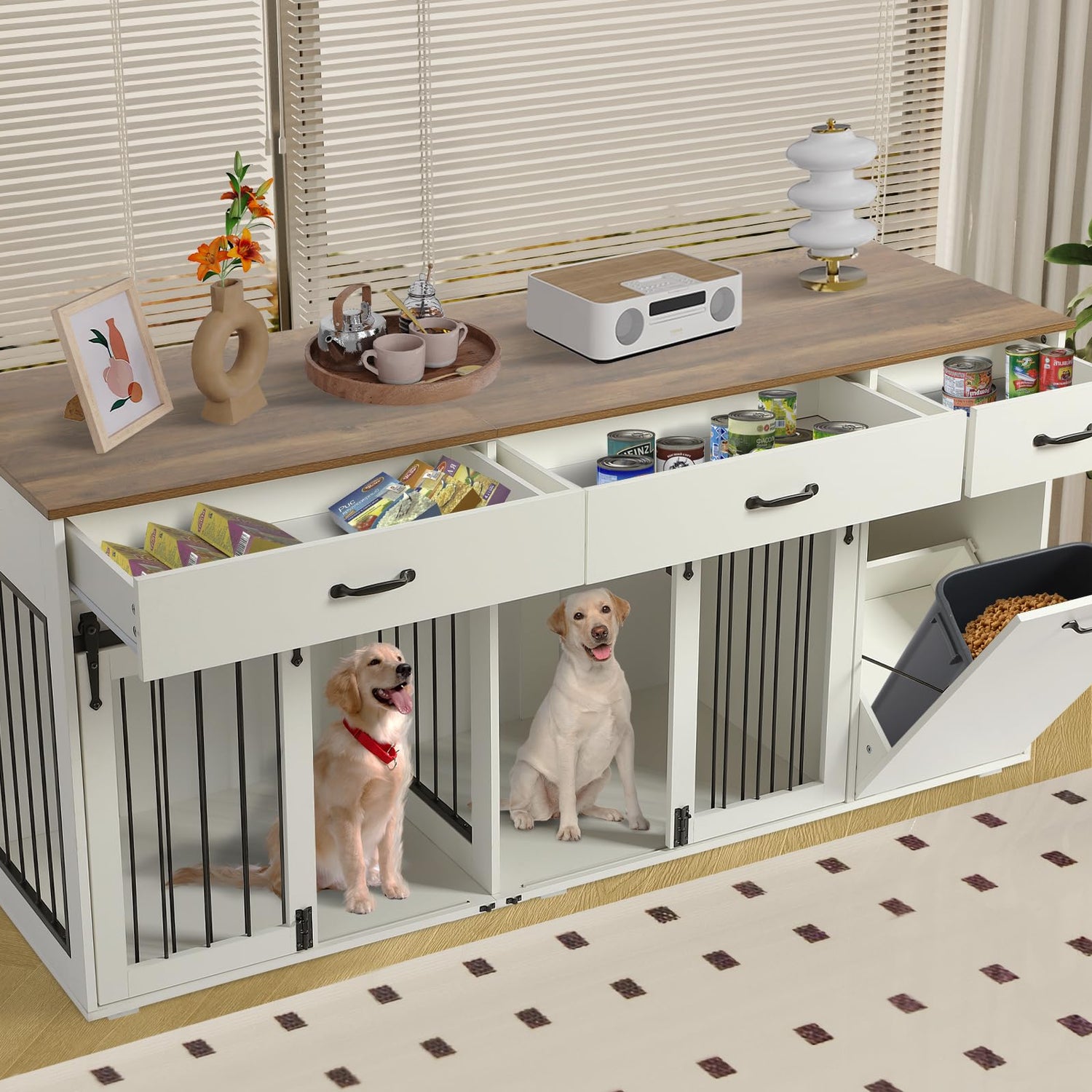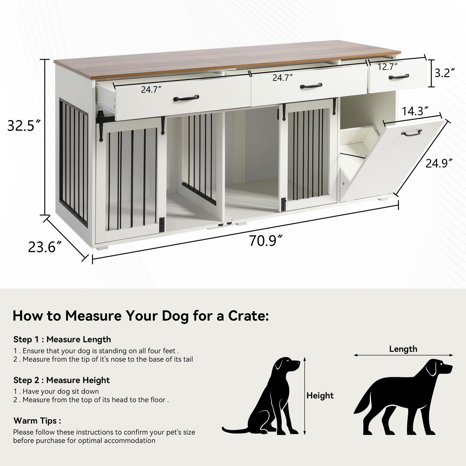 - Large Storage Dog Kennel: The size of this large dog crate is 70.9" L x 23.6" W x 32.5" H, help you make best use of space. Our indoor dog crate has 3 drawers and 1 tilt out cabinet for extra storage, for dog leashes, treats, toys and other items