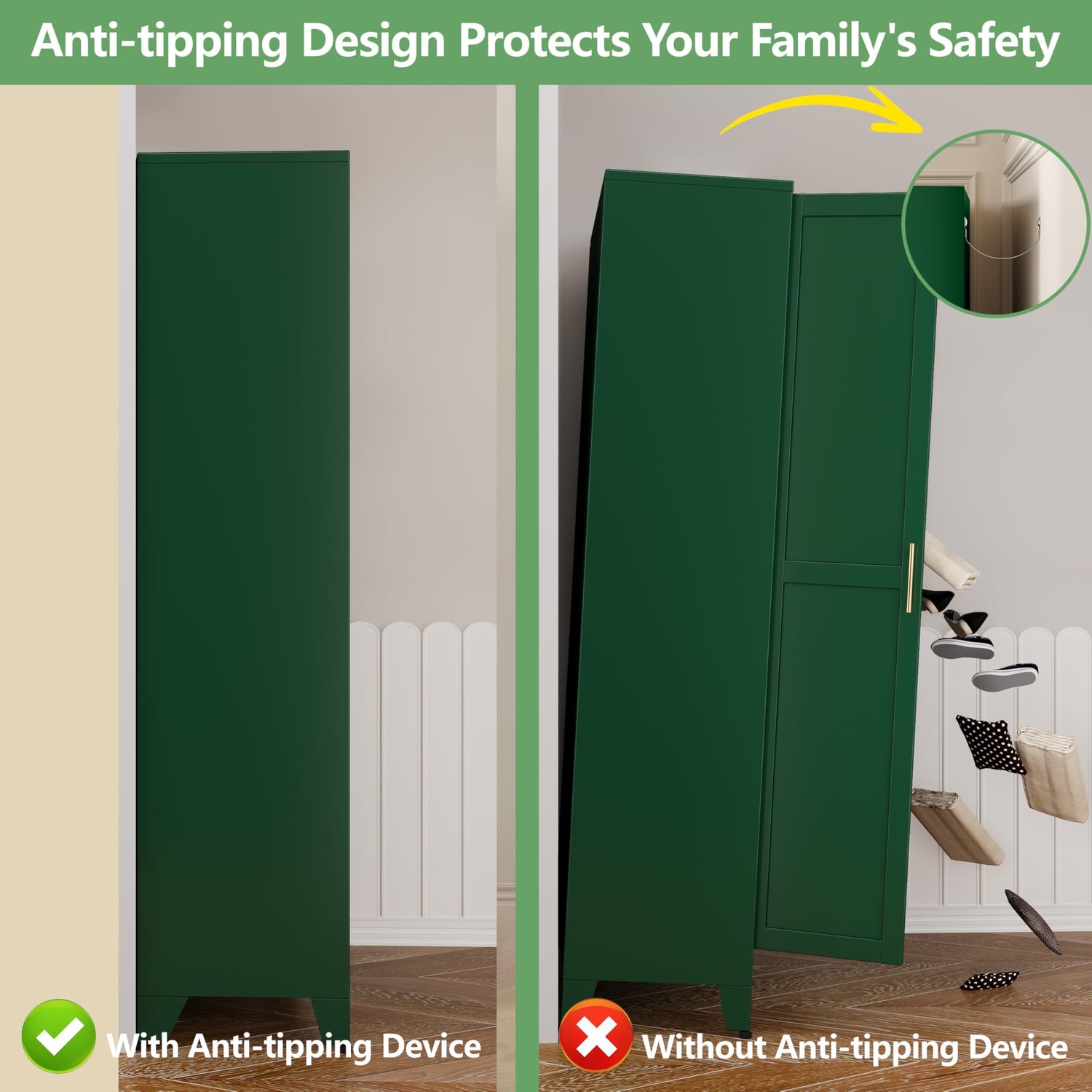 71" H Metal Armoire Wardrobe Closet, Adjustable Shelve, Clothes Drying Pole, Steel Wardrobe Cabinet for Bedroom (Green)