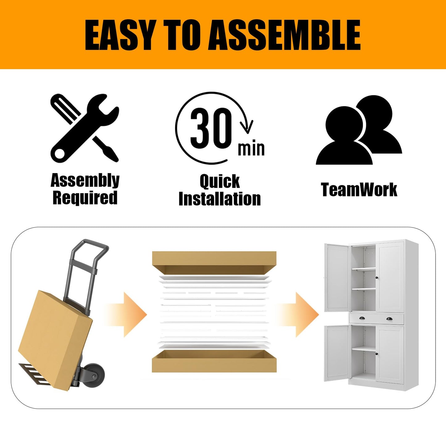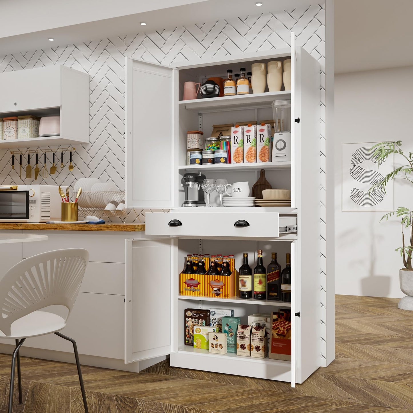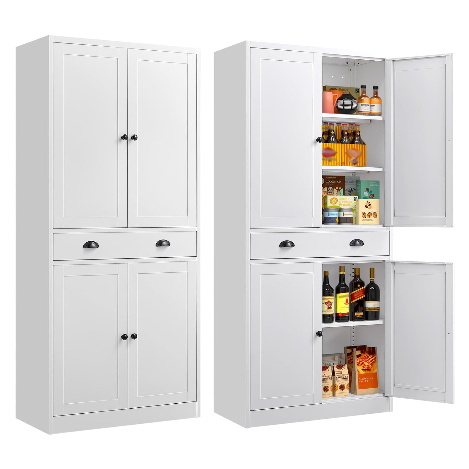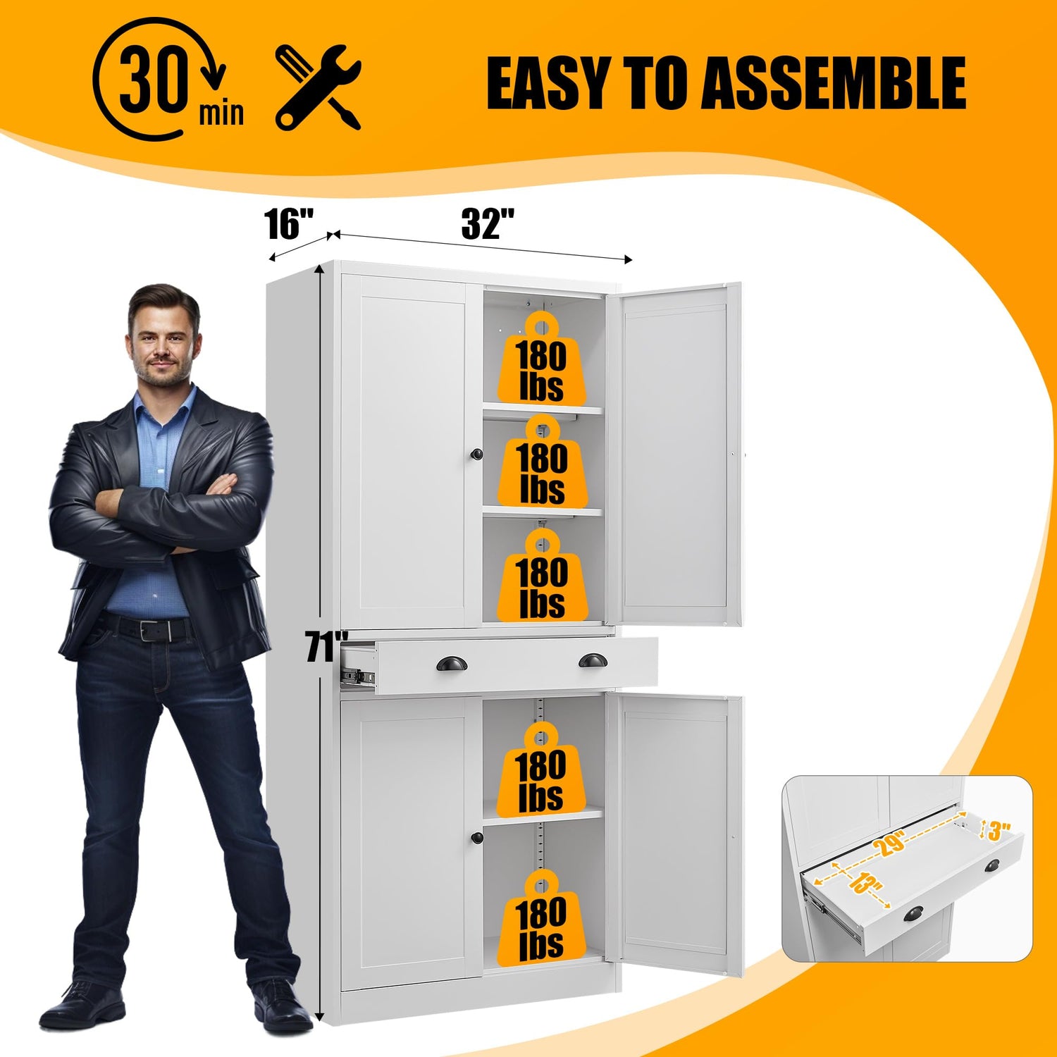71" Kitchen Pantry Cabinet, Metal Storage Cabinets with Adjustable Shelves and Drawer, White Pantry Cabinets, 4 Doors Metal Pantries Cabinet for Kitchen, Dining Room, Living Room - Assembly Required