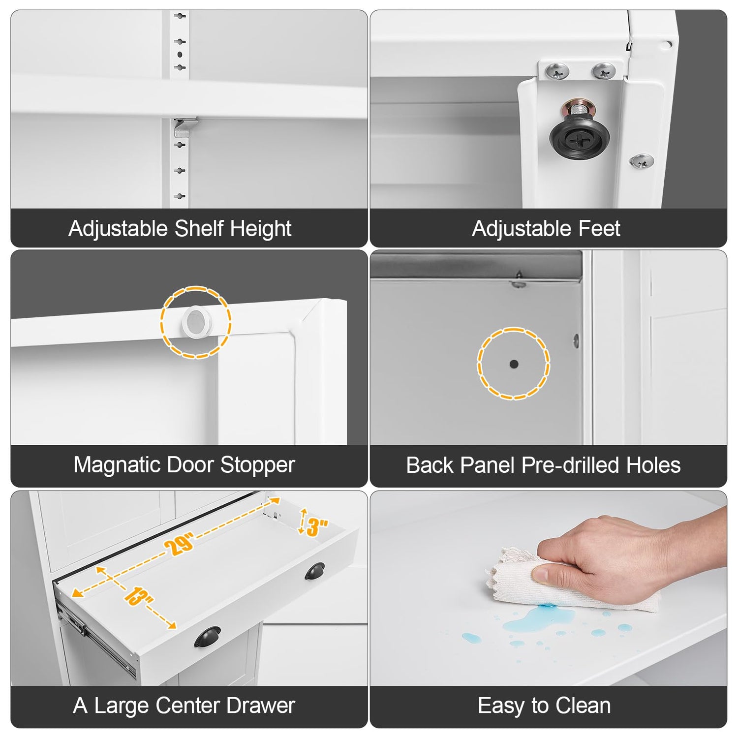 - Cabinet Composition: The kitchen storage cabinet with 2 magnetic closing doors, 3 adjustable shelves, and adjustable height to meet your personal needs. There is a central drawer with smooth sliding rails, allowing you to use it smoothly without making any noise