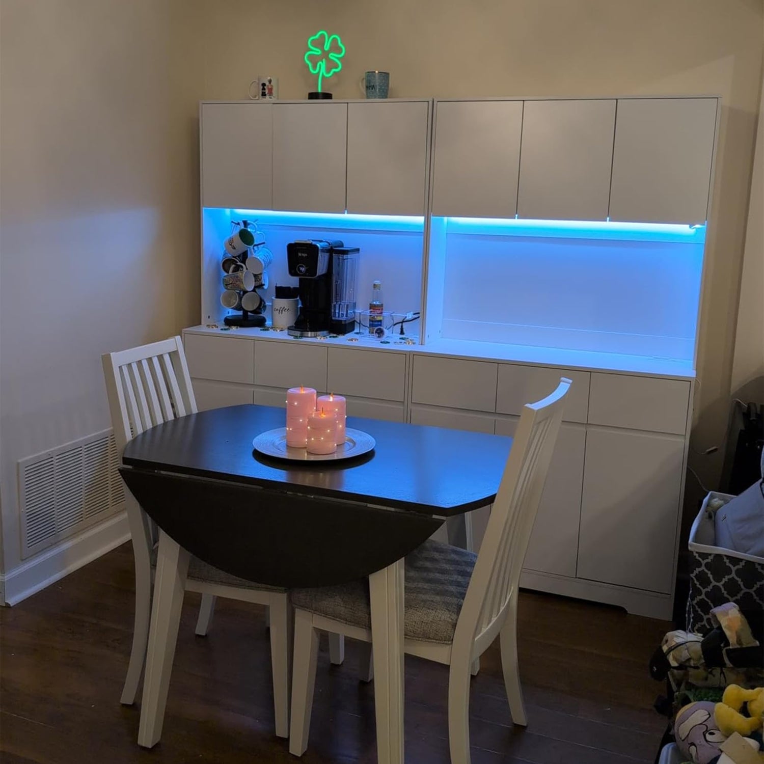 - 🏡 Multi-Functional Tall Kitchen Storage Cabinet:This kitchen pantry storage cabinet is designed to be versatile. The LED light helps brighten up your kitchen, making it easier to prepare food and drinks like coffee and toast, even in spaces with limited light. The open charging station is perfect for keeping your devices handy, while the solid doors protect your kitchen essentials from dust and keep everything neatly stored inside.
