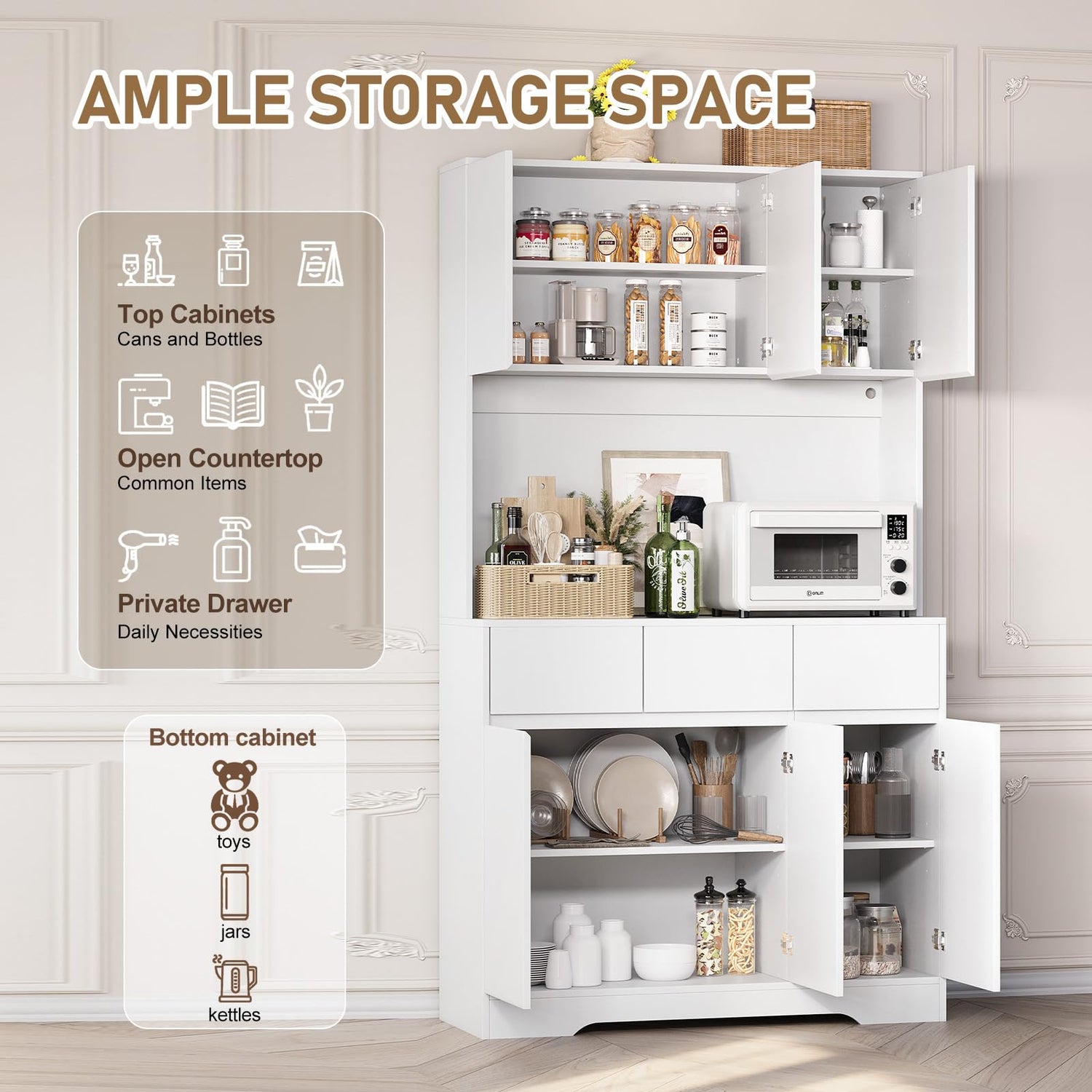 - 📦 Ample Storage Space:This kitchen storage cabinet features a spacious open countertop, ideal for food preparation or displaying kitchen essentials. It offers 4 enclosed cabinets, each with an adjustable shelf, and 3 easy-glide drawers for smaller items. Whether storing microwave ovens, toasters, coffee machines, or wine glasses, this kitchen pantry storage cabinet provides a well-organized space for all your kitchen needs.