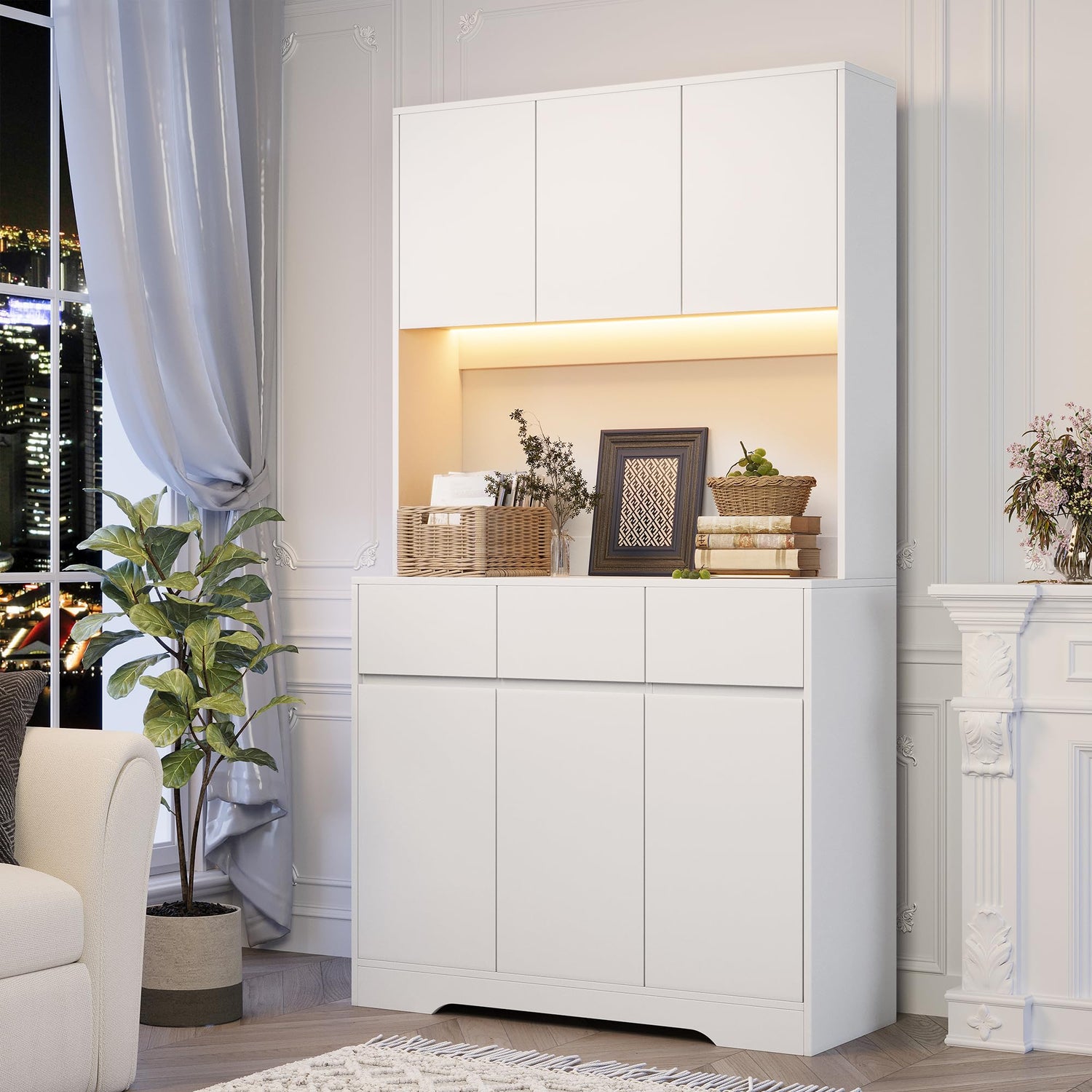 71'' Pantry Cabinet with LED Light Charging Station, kitchen storage cabinets with Microwave Stand, Freestanding Kitchen Hutch,kitchen cabinet with Open Countertop for Dining Room,Restaurant,White