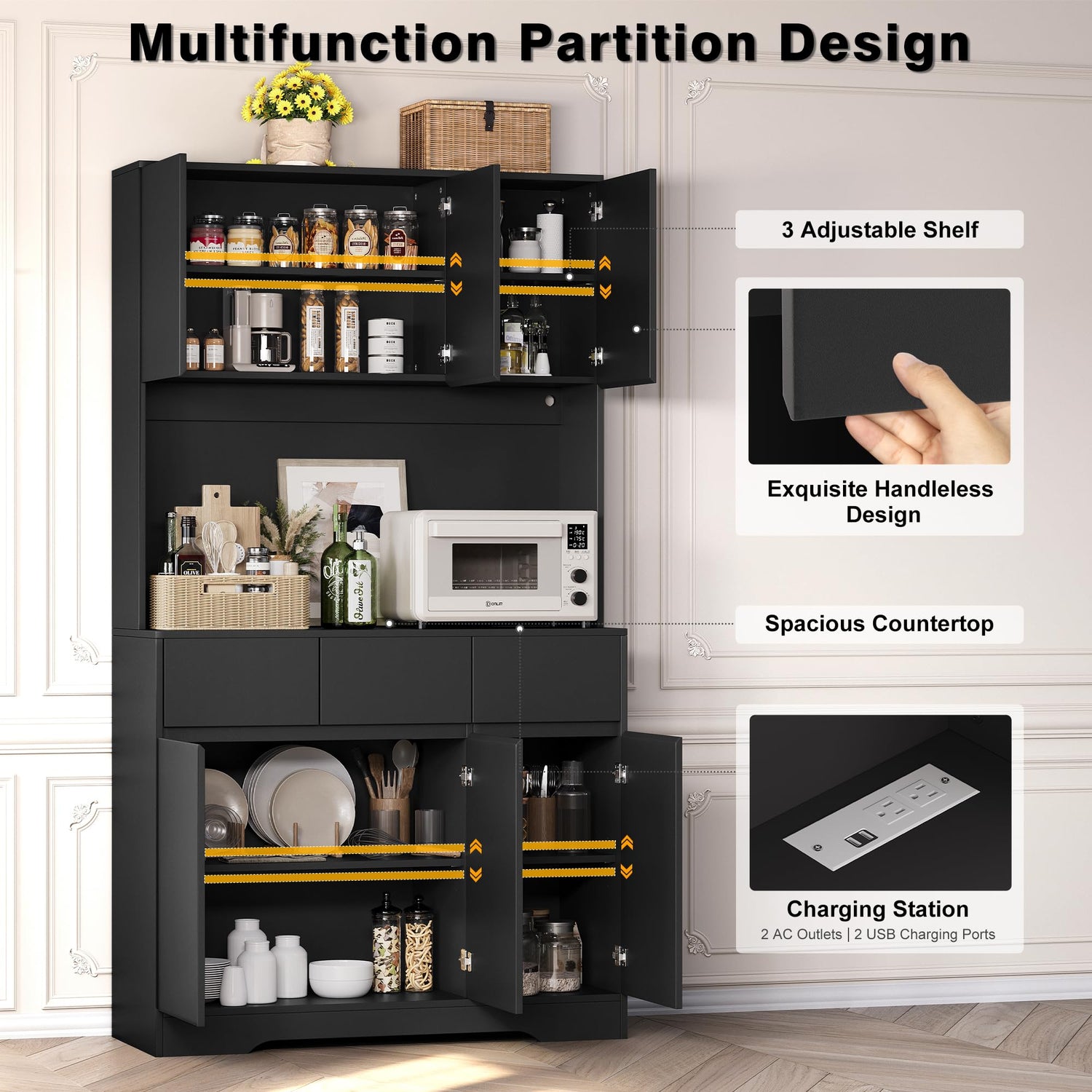 - 📦 Ample Storage Space:This kitchen storage cabinet features a spacious open countertop, ideal for food preparation or displaying kitchen essentials. It offers 4 enclosed cabinets, each with an adjustable shelf, and 3 easy-glide drawers for smaller items. Whether storing microwave ovens, toasters, coffee machines, or wine glasses, this kitchen pantry storage cabinet provides a well-organized space for all your kitchen needs.