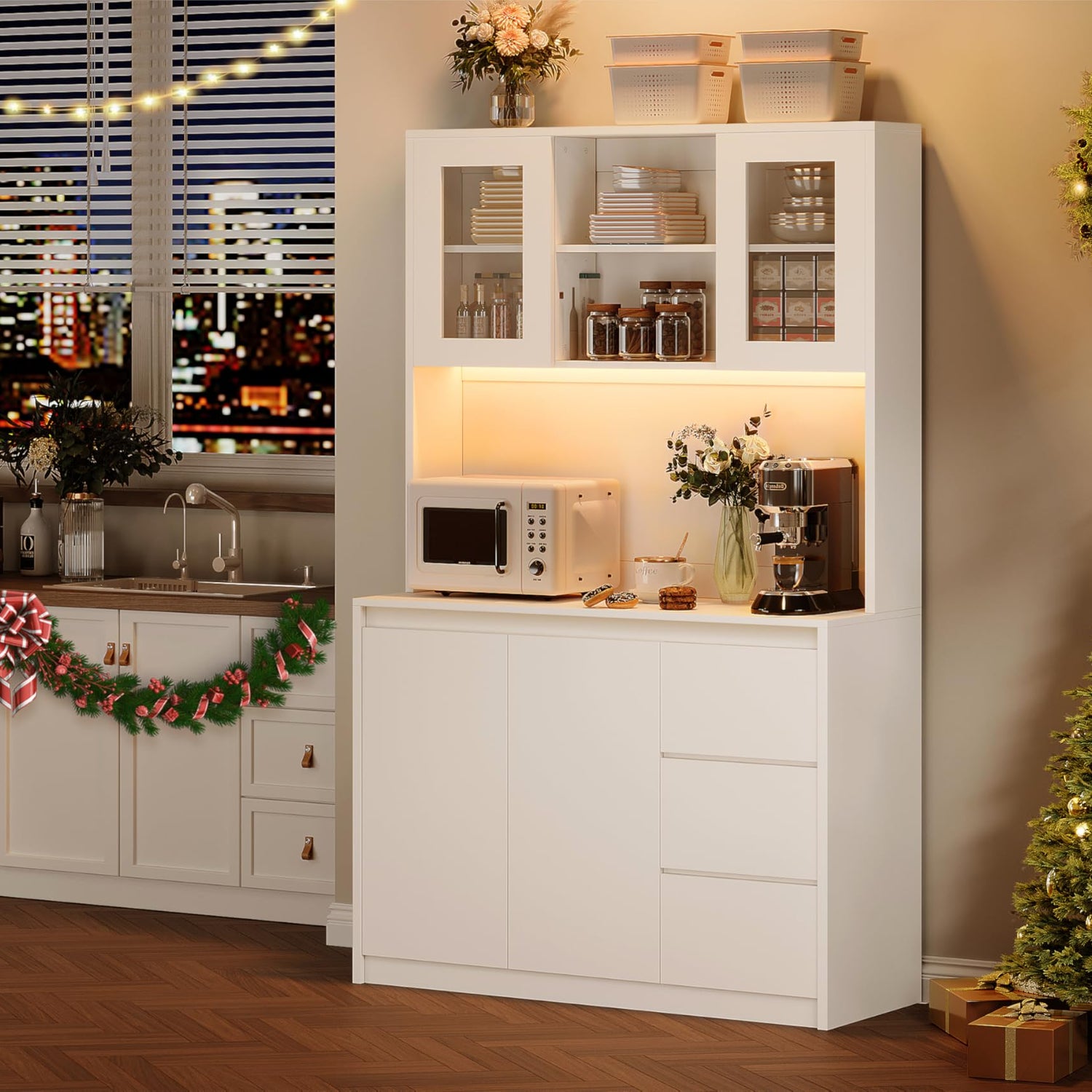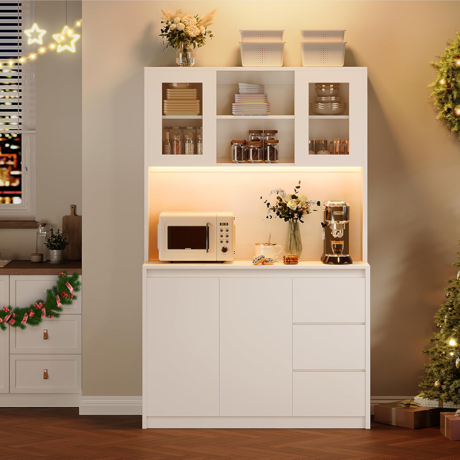 - Fully Customizable Storage - Adapts to your needs with 3 drawers + 4 adjustable shelving units that support heavy appliances. The spacious countertop doubles as a breakfast station or small appliance hub.
