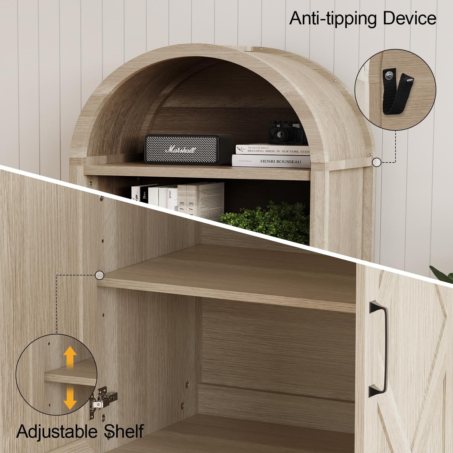 - 【Natural Wood Grain】 Crafted with premium wood, this arched Kitchen Pantry Cabinet boasts a unique grain pattern on every piece. Wood bookshelf's arched top design adds a stylish, warm vibe to any room!