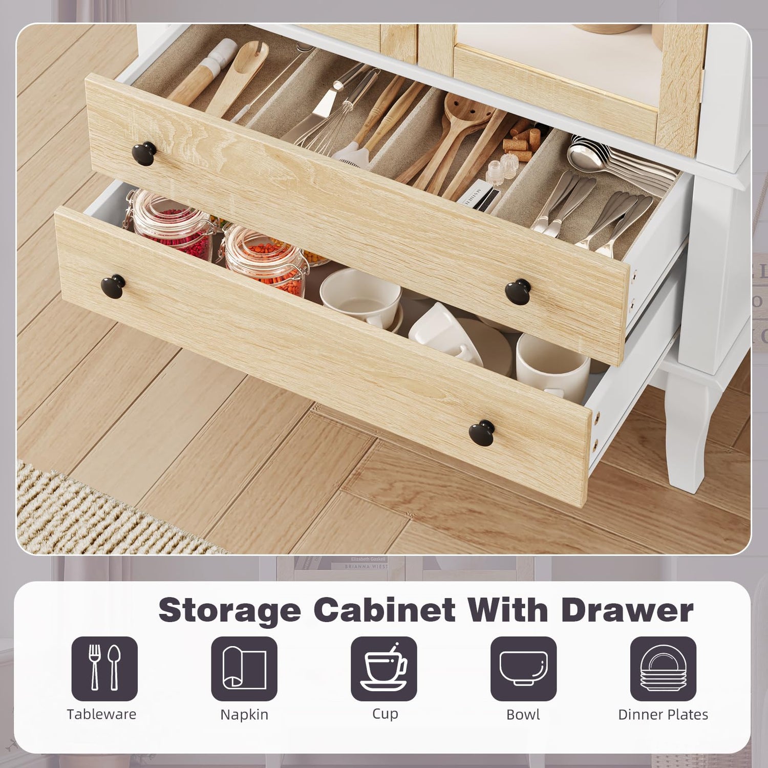 - 【Stylish Arched Design】 Our kitchen pantry cabinet is designed with graceful arched silhouette adds modern sophistication to your living space. Adjustable shelves and spacious drawers ensure your kitchen essentials are stored neatly and easily accessible. This cabinet comes with 2 glass doors to display organized pantry items. The arched storage cabinet combines design with practicality, making it ideal for the kitchen.