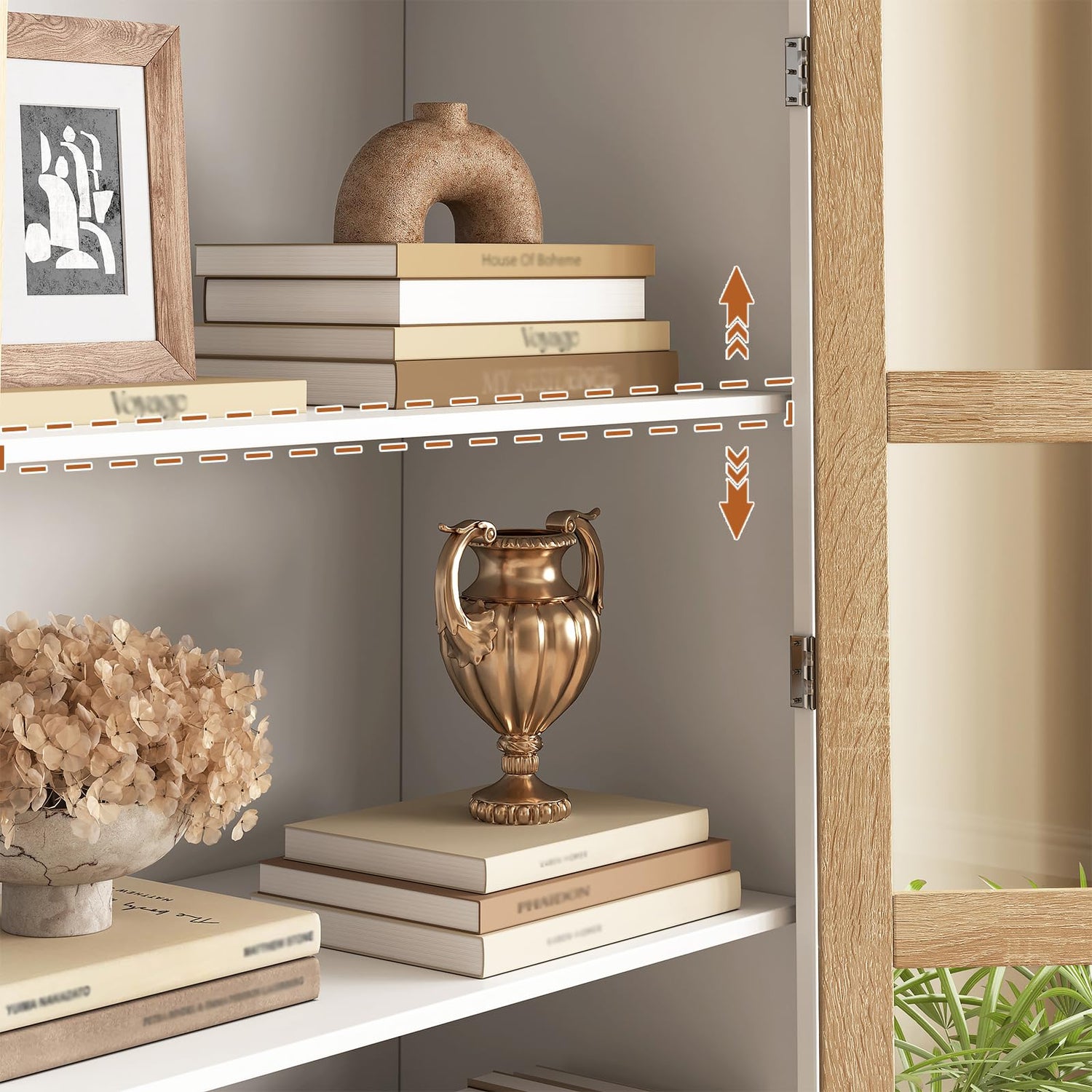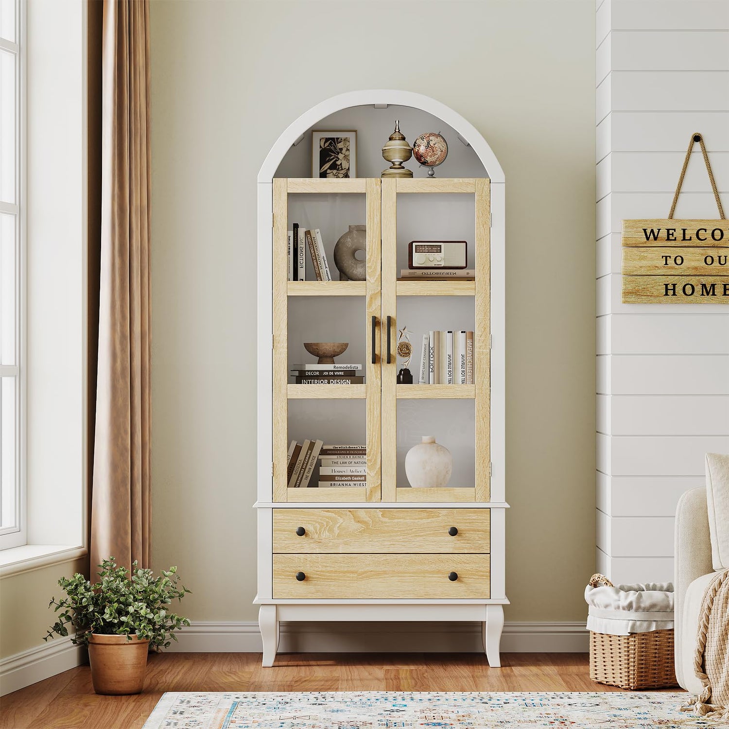 71" Tall Arched Kitchen Pantry, Modern Farmhouse Wood Kitchens Storage Cabinets with 2 Large Drawers and Adjustable Shelves, Arched Display Cabinet with Glass Doors for Dining Room, Bathroom