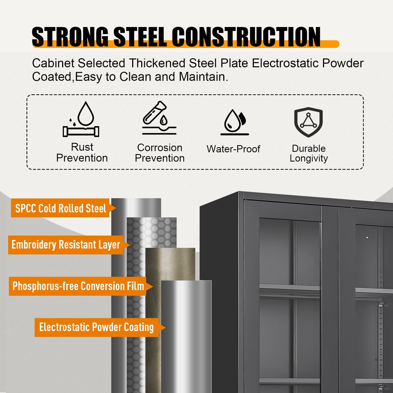- Security Door Lock System: The kitchen storage cabinet has 2 hinged doors with a 180 degree opening angle, and the tall metal cabinet adopts a three-point door lock to protect valuable items. This includes three keys, which can be used by co owners or as backup keys in case of loss