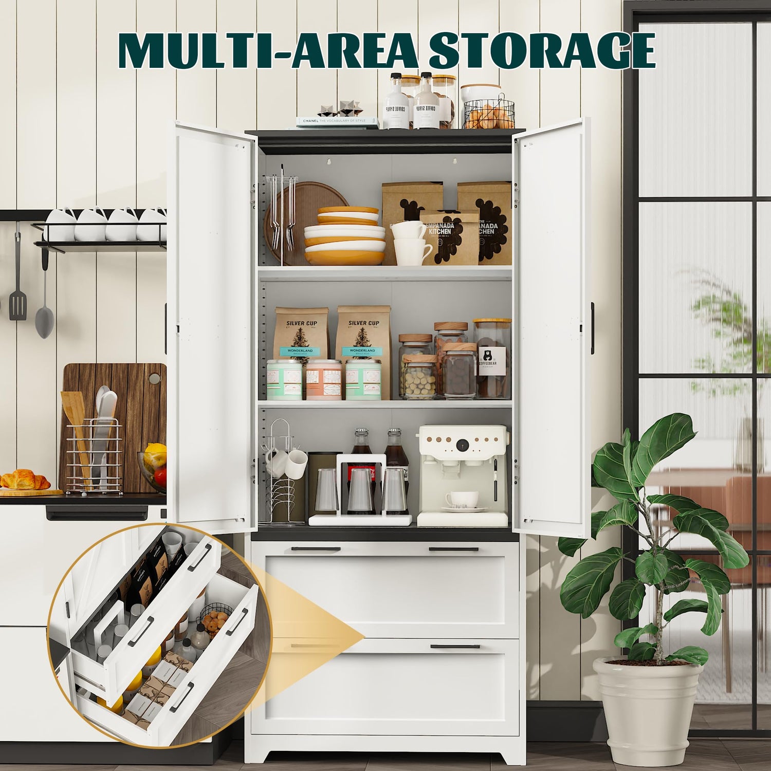 - Reasonable planning of your space: The shelves of pantry storage cabinet can be removed, and the same can be adjusted up and down. Feel free to move up and down without vertical distance limitation, more freedom. Storage cabinet can meet your customized needs for your storage space. The bottom double sliding drawers make it easier for you to categorize your storage items, and the neat storage is soothing.