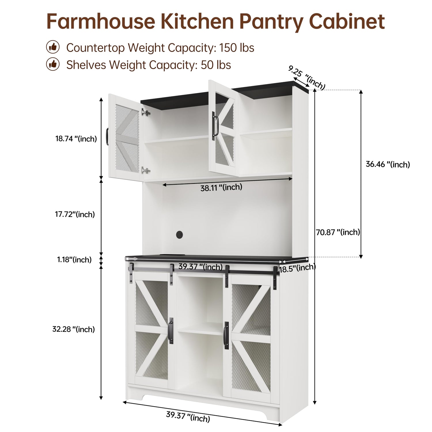- Ample Storage Space: The kitchen pantry boasts a generously sized countertop, providing ample space for a microwave, coffee maker, or other kitchen appliances. In addition to the spacious countertop, the cabinet features four grille-front doors that add a rustic touch while allowing visibility and airflow. Two open storage compartments offer quick access to frequently used items, making it easy to store and organize everything from food and kitchen gadgets to tableware and utensils. The thoughtful design of the pantry storage ensures that you have all the space you need to keep your kitchen clutter-free and efficient