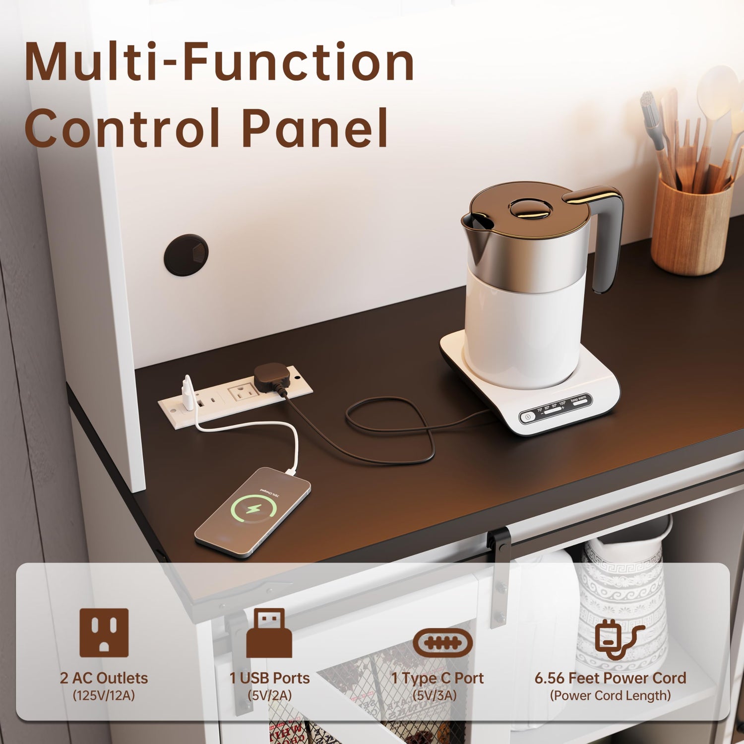 - Built-In Charging Station: This kitchen storage cabinet is designed for modern convenience, featuring a built-in charging station that includes two power outlets, a USB port, and a Type-C port. This setup is perfect for powering kitchen appliances such as coffee makers, microwaves, and blenders, simplifying your cooking routine. With easy access to power, you can keep your kitchen gadgets fully charged and ready for use, enhancing the functionality of your kitchen space