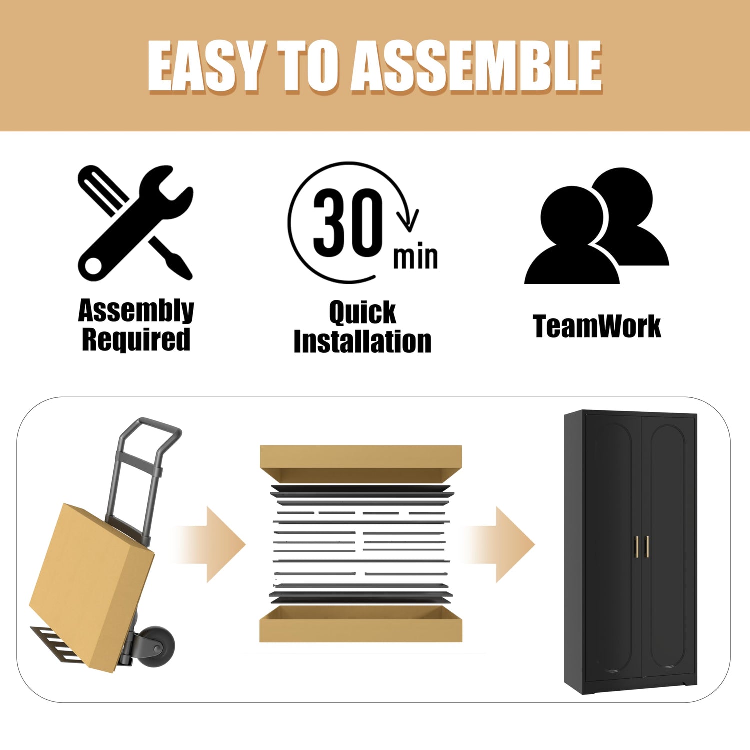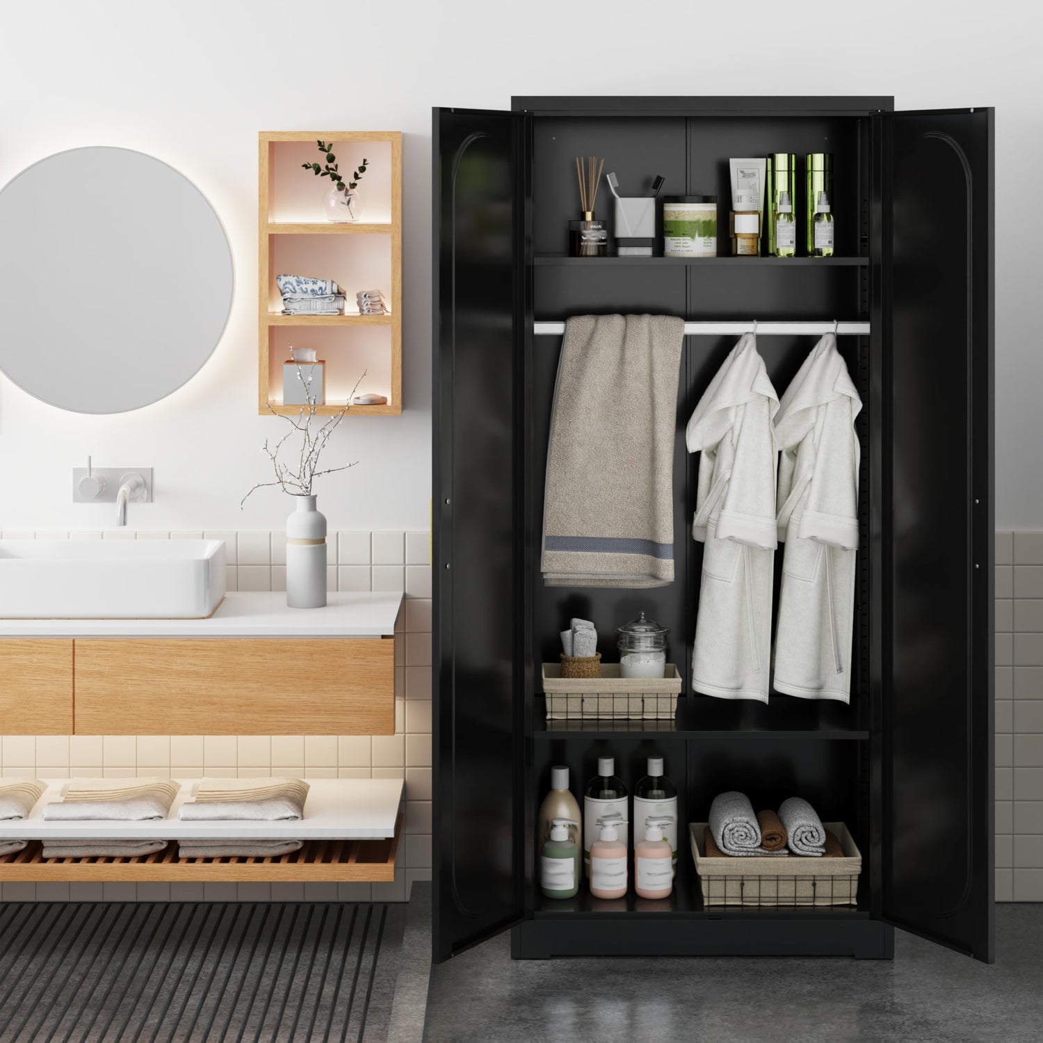 - Metal Material: The storage cabinet is made of cold-rolled steel plate, with a powder coating process to prevent rusting. Sturdy, easy to clean surfaces. Black tall armoire wardrobe come with an anti-tip feature that prevents the cabinets from tilting and protects your family