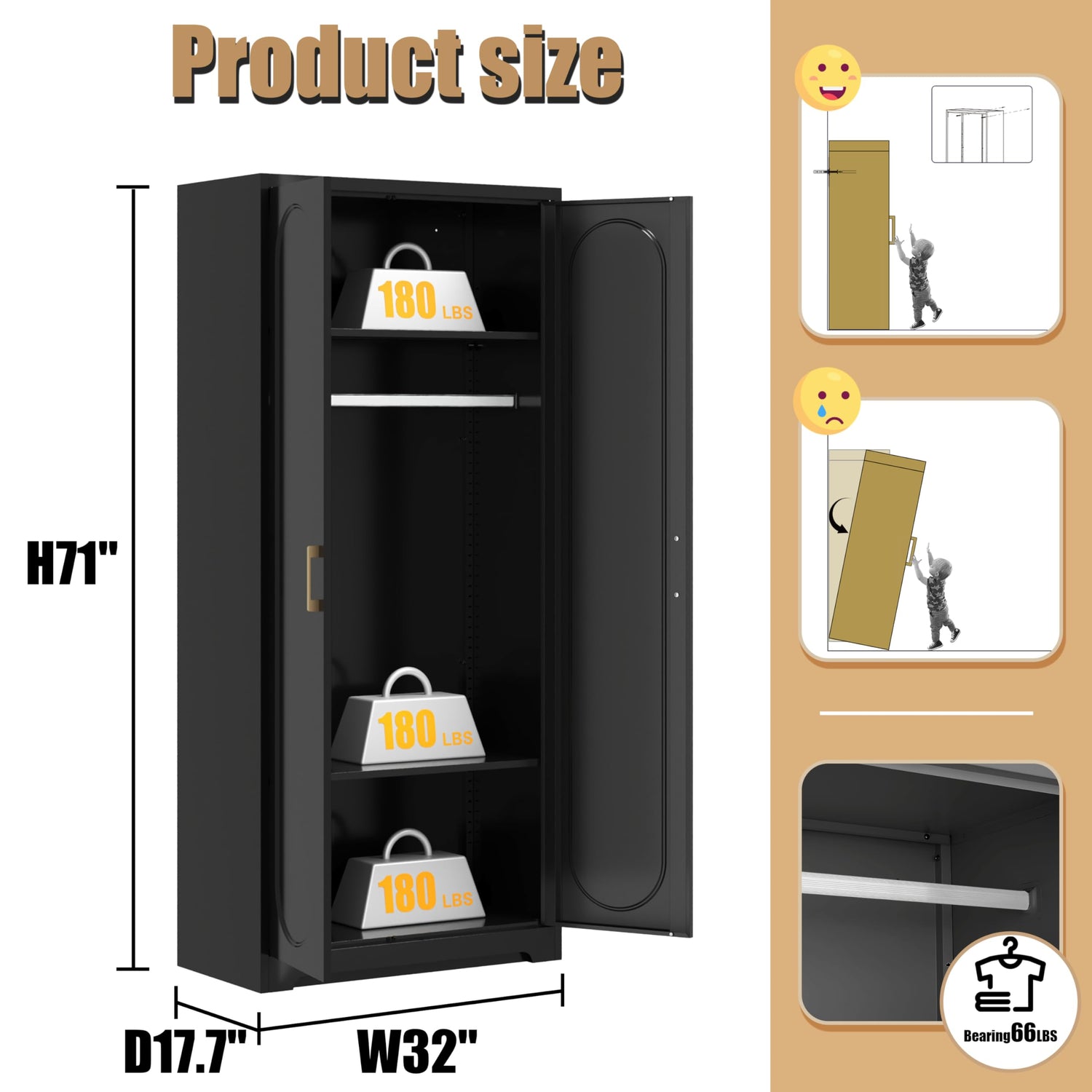 - Large Capacity Storage: 71" tall metal armoire has 2 doors and 2 adjustable shelves, allowing you to move the shelves as needed to create flexible storage space. Each shelf has a weight limit of 180 lbs. Clothes rod has a weight capacity of 66 lbs