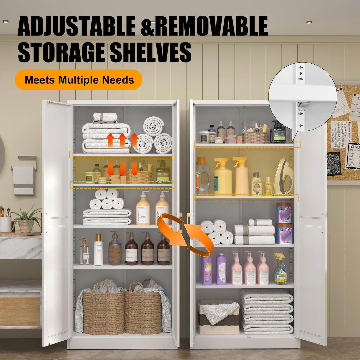 - Metal Storage Cabinet: The tall pantry cabinets is made of cold-rolled steel plate, with a powder coating process to prevent cracking and rusting, increasing the safety and stability of the product. The white cabinets come with an anti-tip feature that prevents the cabinets from tilting and protects your family. Metal cabinets are sturdy, with easy to clean surfaces