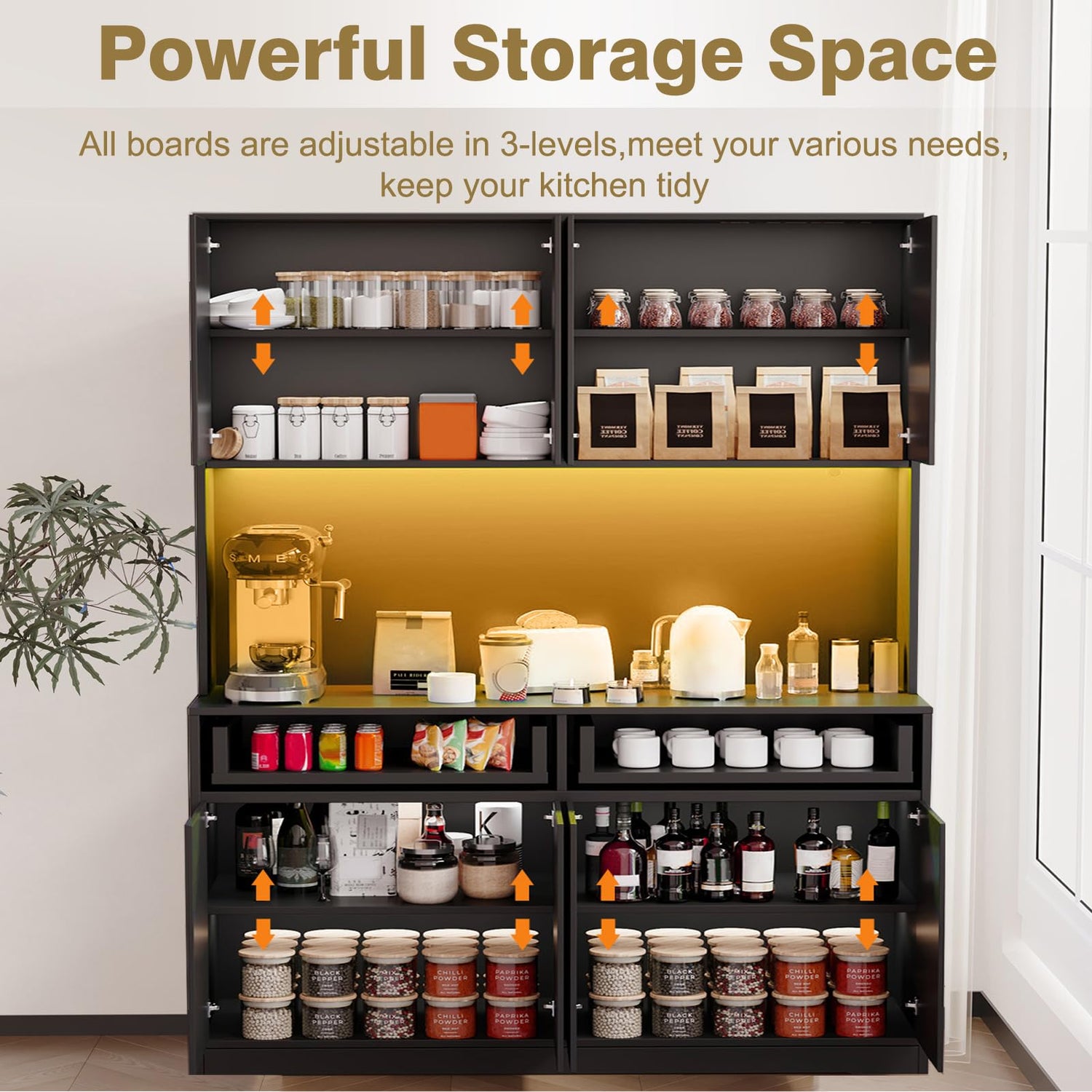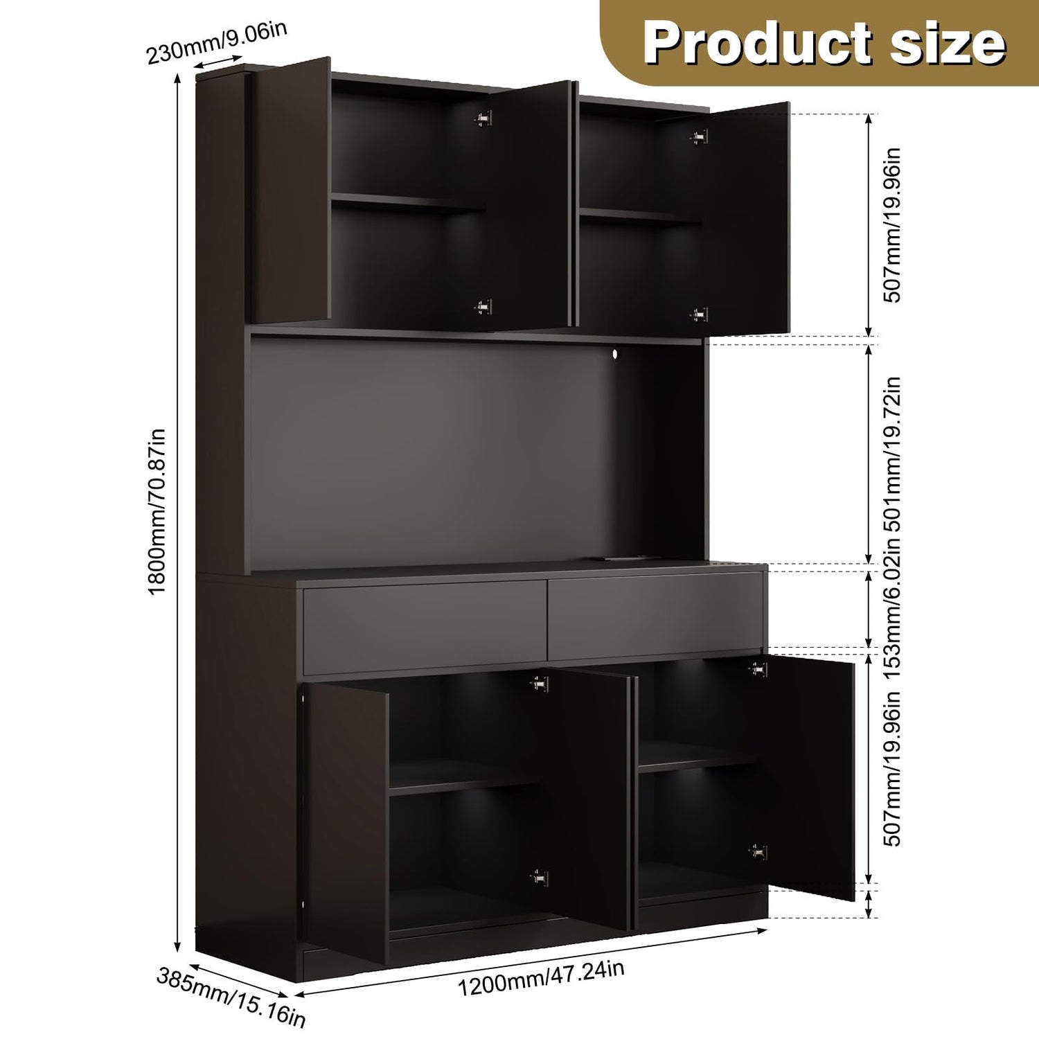 - Kitchen Pantry with Large Storage: This 72" tall 47" wide large pantry storage cabinet comes with 2 large center drawer,4 large storage cabinets with adjustable storage, and 1 adjustable shelf which can meet different heights of storage needs.Spacious countertop is high enough to accommodate effortlessly microwave and coffee maker.