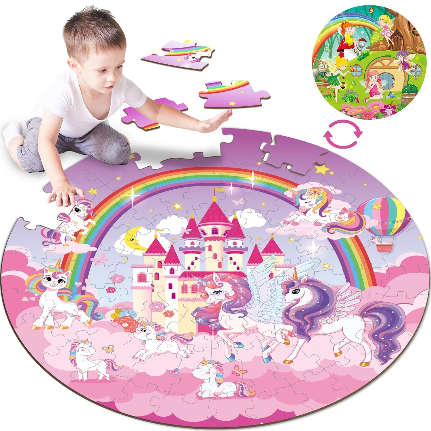 71Pcs Unicorn Fairy Jigsaw Puzzles for Girls Ages 3-5 Fairy Double Sided Puzzle for Kids Rainbow Castle Round Floor Puzzles Xmas Party Supplies Preschool Brain Teaser Educational Toys