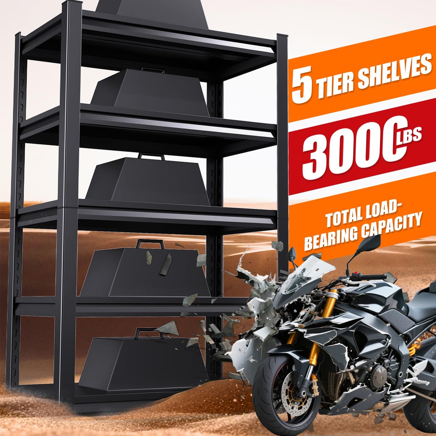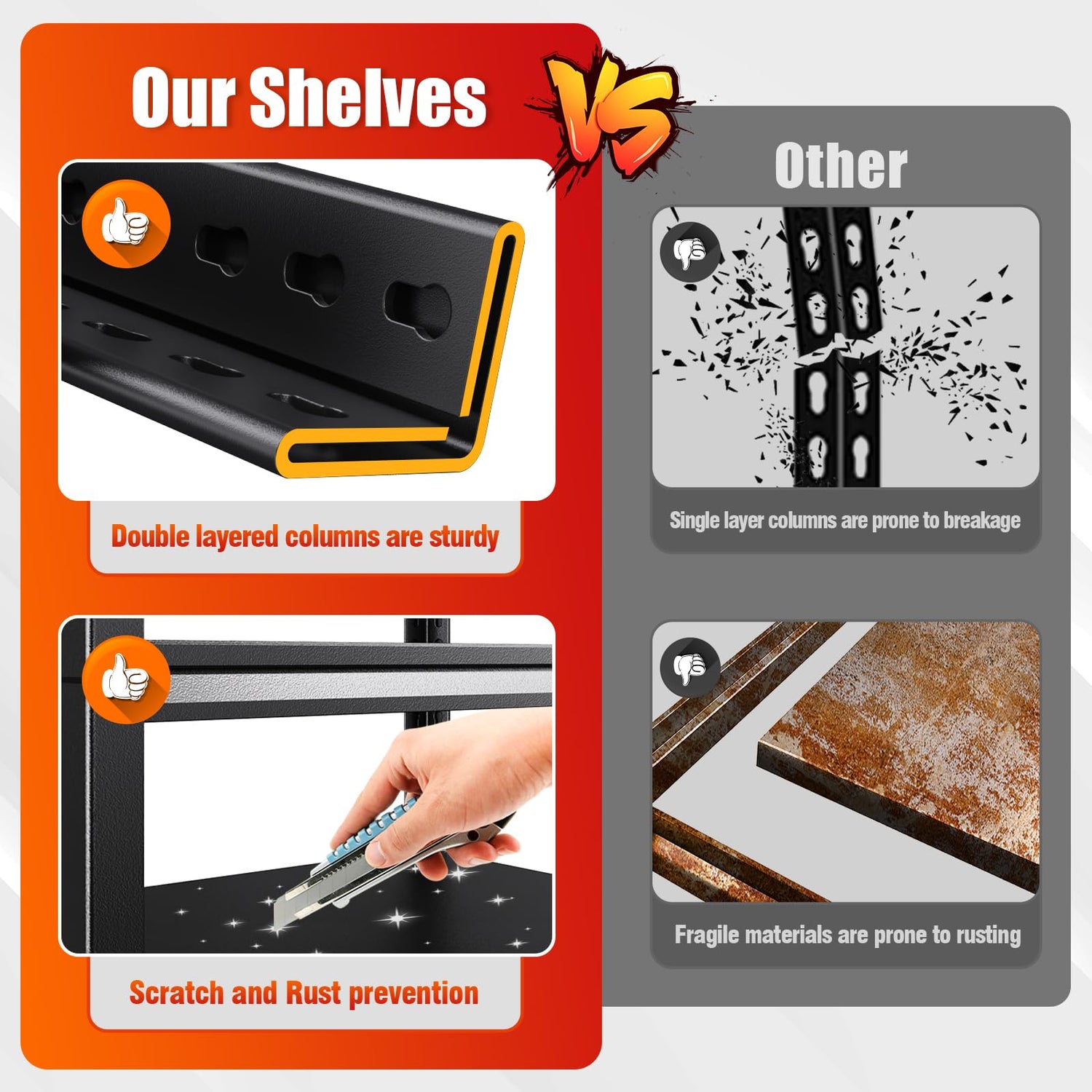 - 3000 LBS Garage Storage Shelves Heavy Duty : The heavy-duty garage shelving units are constructed with thickened heavy-duty steel columns, which provide a solid support foundation for the shelves and significantly enhance the overall stability. Each shelf can bear a weight of up to 600 pounds, and the total load-bearing capacity of the entire shelving unit reaches 3000 pounds, easily meeting the storage needs of various heavy-duty goods