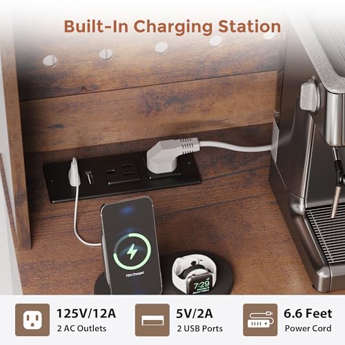 - 47‘’ WIDE COUNTERTOP WITH CHARGING STATION: With a 47.3-inch wide countertop, this coffee bar offers ample space for your essentials. Equipped with two AC outlets and two USB ports, it easily supports appliances like coffee makers, microwaves, and toasters. Say goodbye to outlet shortages and enjoy the convenience