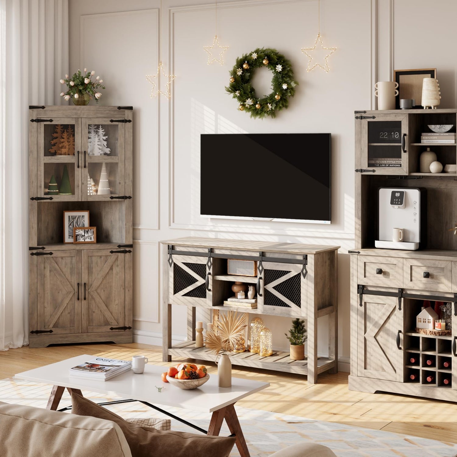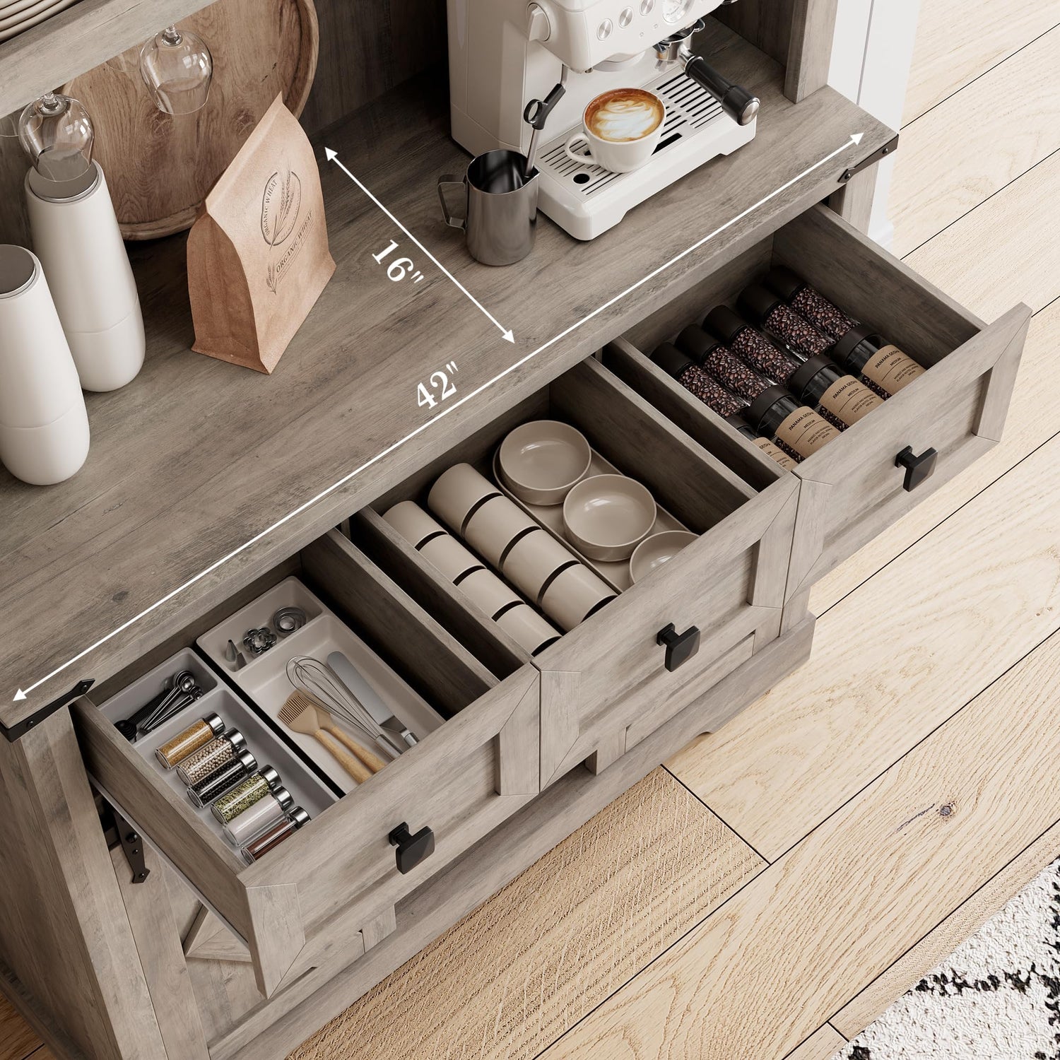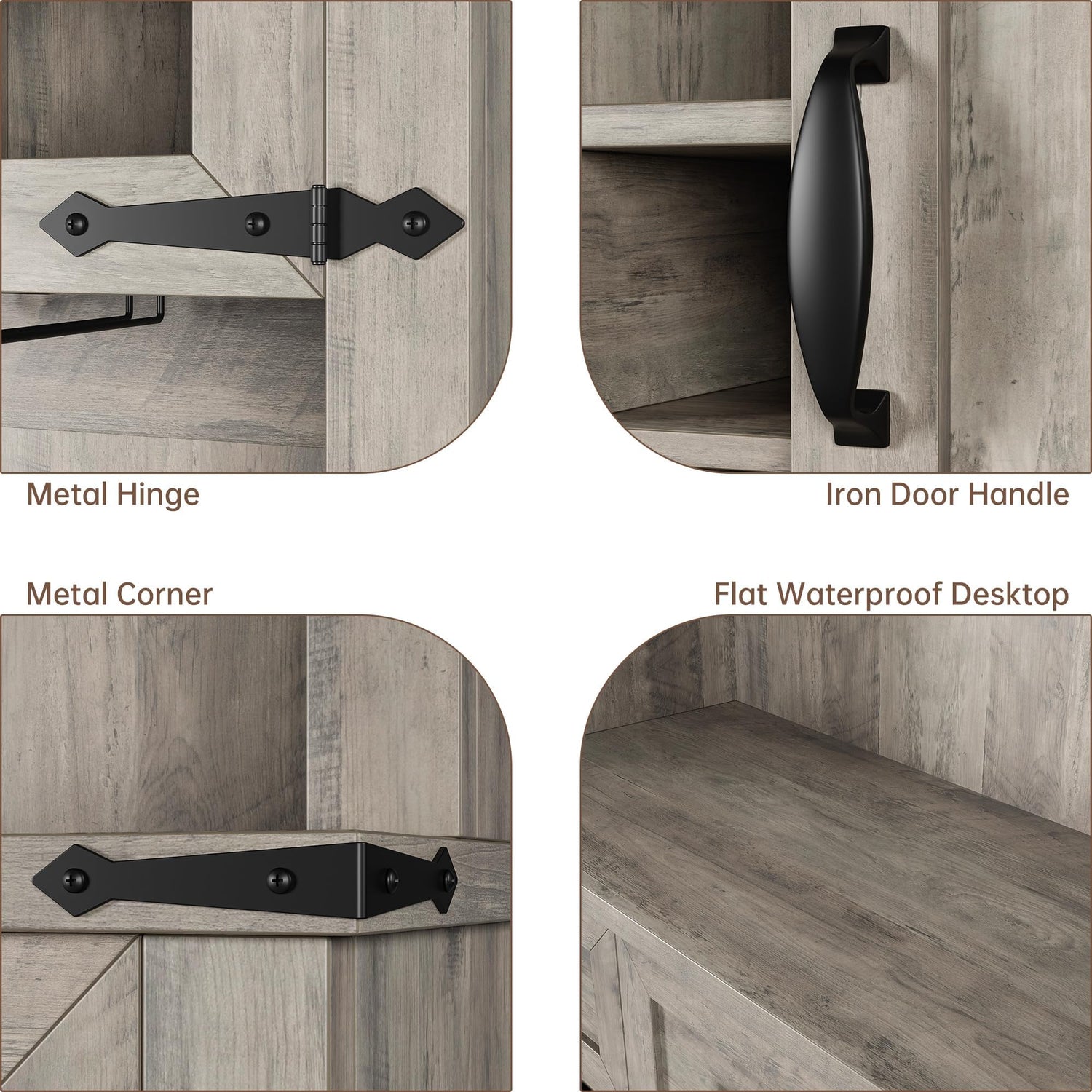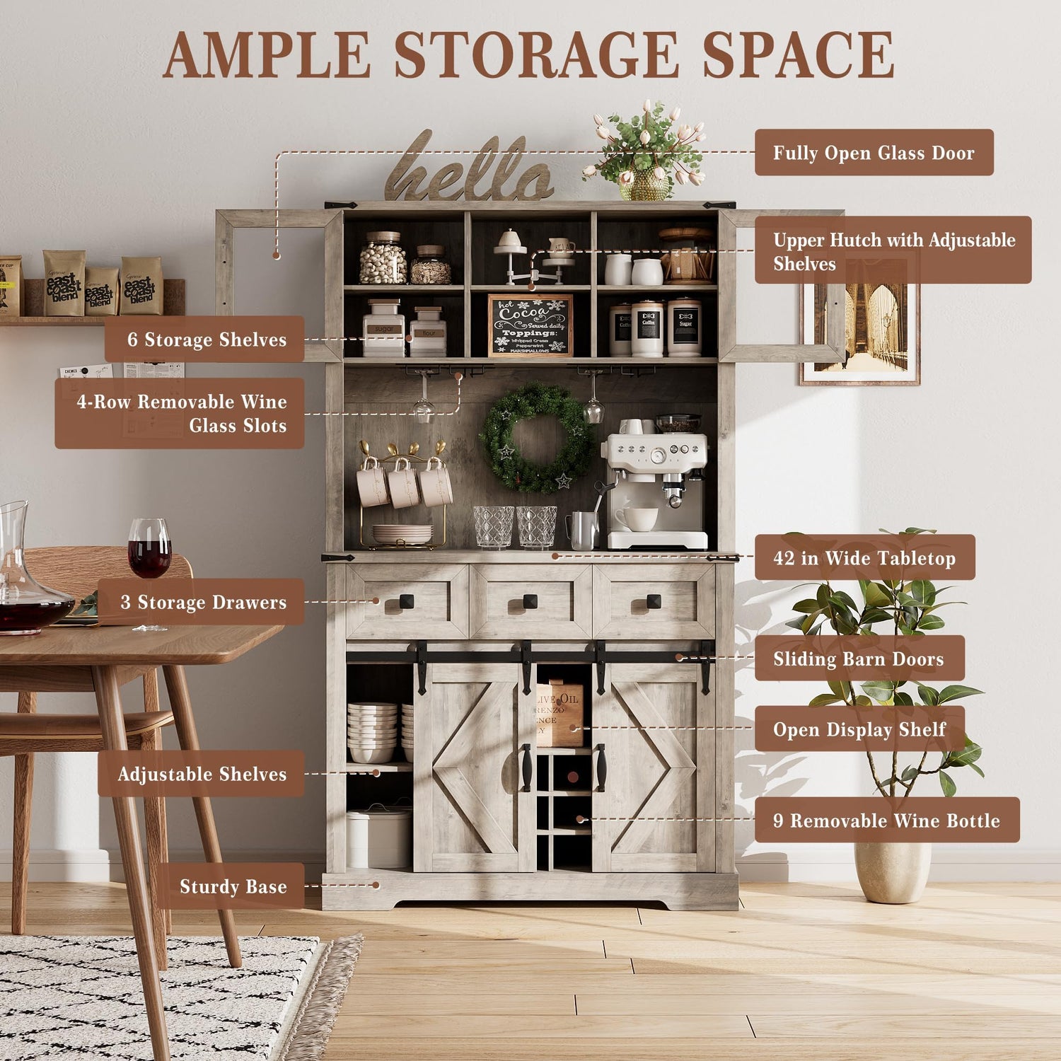 - Sliding Barn Doors: Access the kitchen cabinet with ease using the smooth and quiet sliding metal track. Conceal or showcase the home bar furniture as desired, allowing for customized storage and display options, while allowing for easy access without requiring additional clearance space for the door