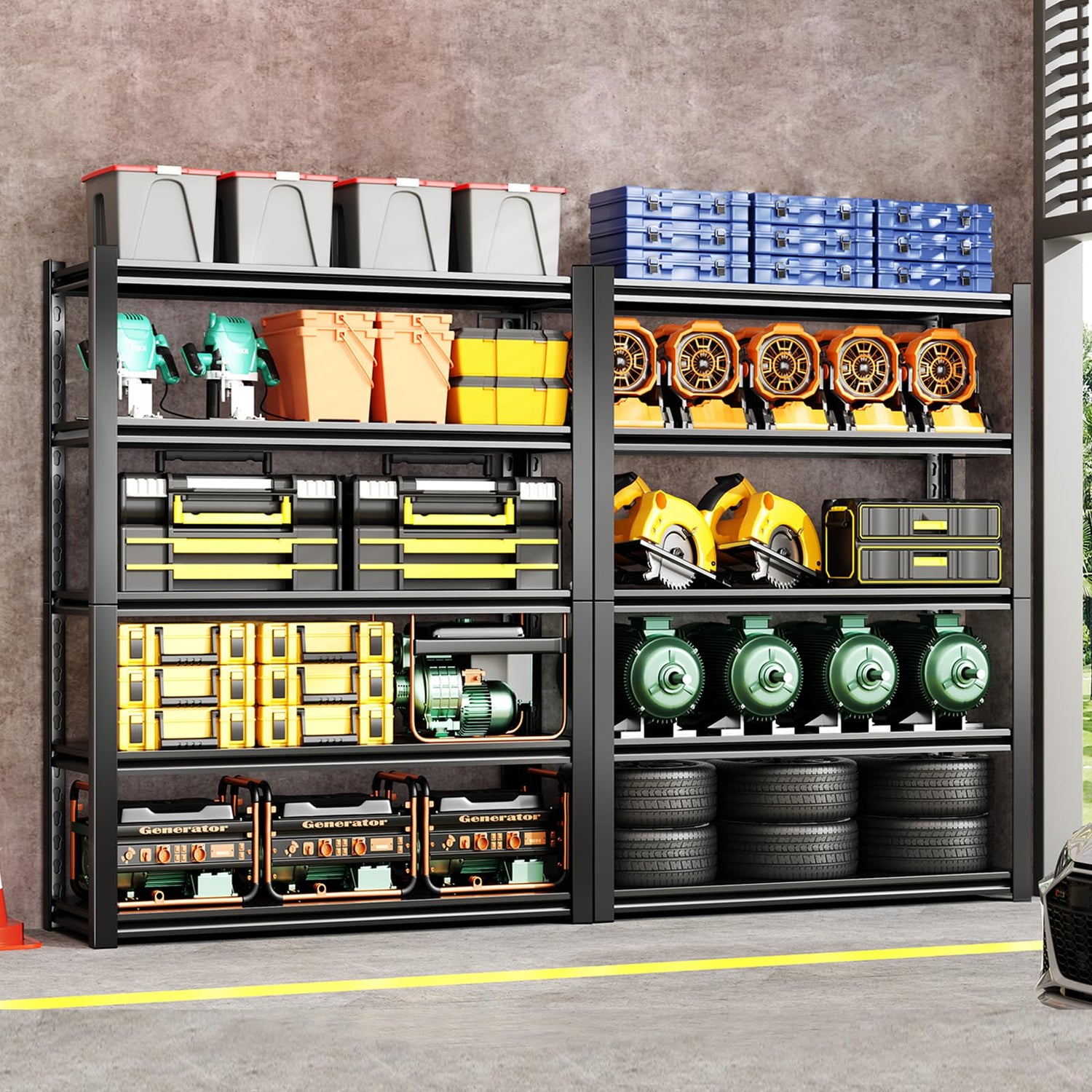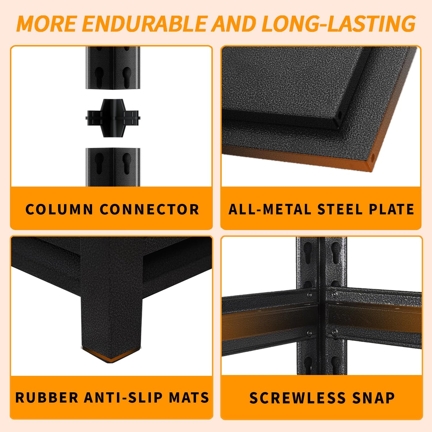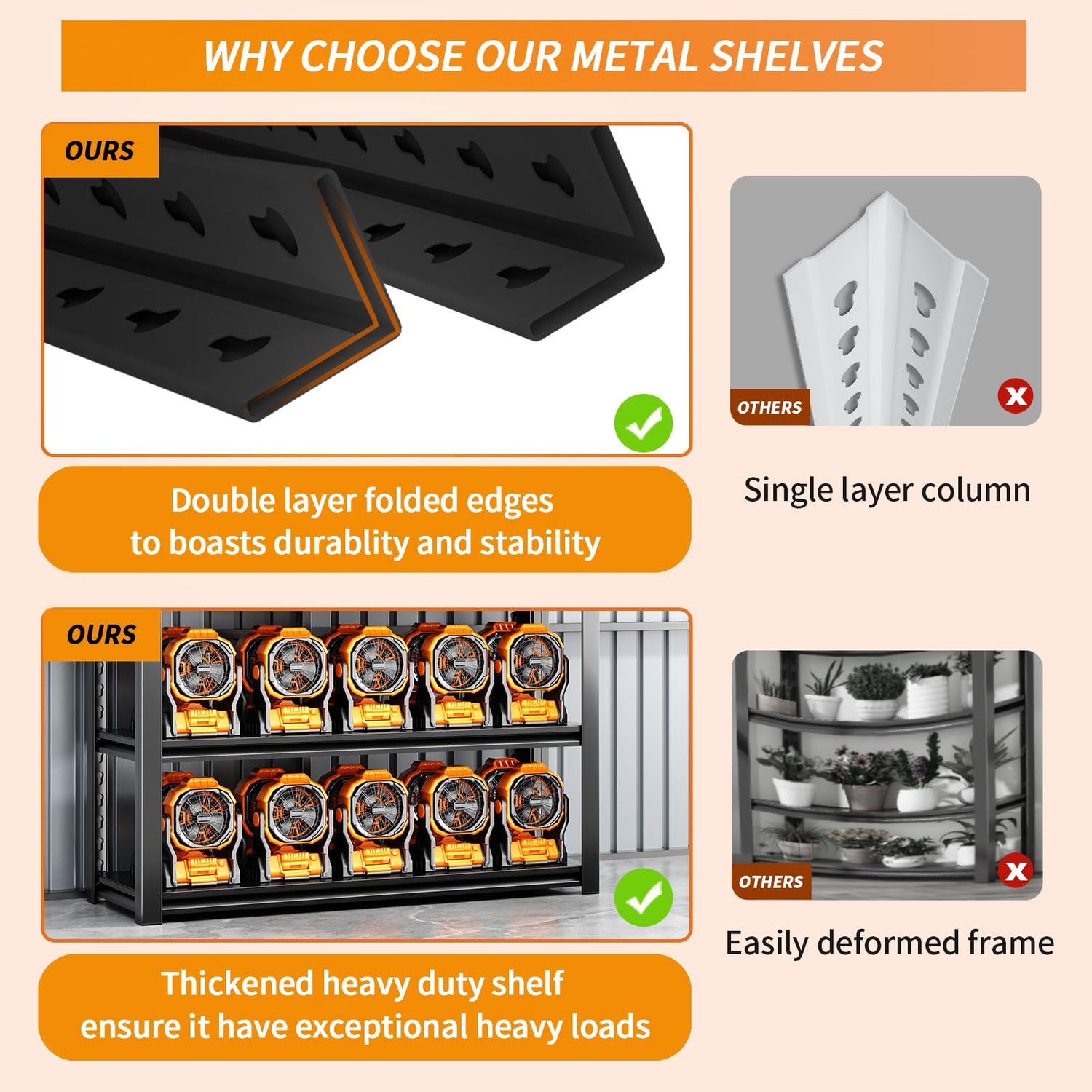 - 【3000LBS Heavy Duty Metal Garage Shelving】Constructed from high quality cold-rolled steel, the storage shelves covered with rust-proof powder coated on all-metal surface, is more sturdy and durable than other ordinary racks. Back of each tier shelving unit with extra stiffener instead of easily deformed wood board can hold up to 600lbs, and a total load weight capacity is 3000lbs. In addition, this heavy duty shelving are double thickened columns, as well as double layer folded edges with multiple details designed to boasts exceptional load-bearing capacity and stability.