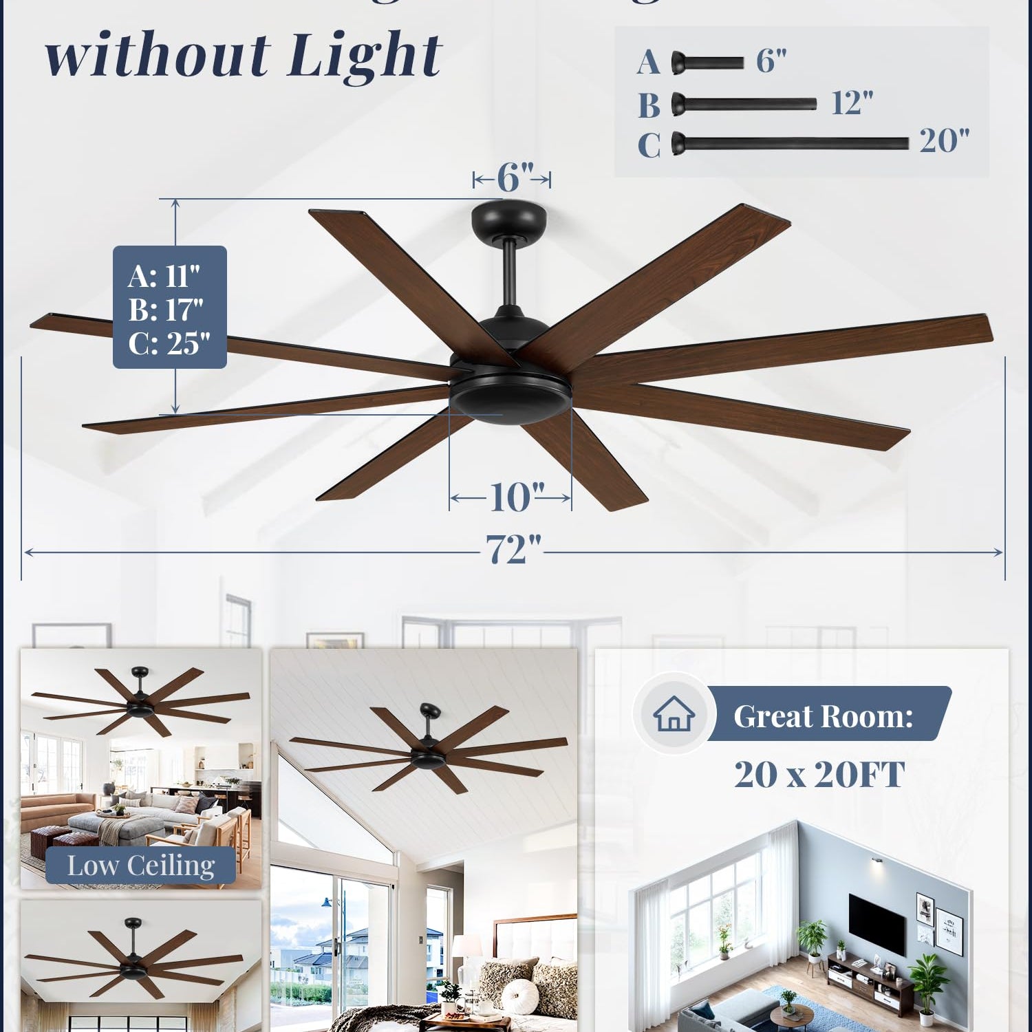 - Large 72 Inch & Dual Finish: This black ceiling fan no light is perfect for larger spaces, providing powerful airflow. Featuring double-sided blades in black and wood Grain, this stylish fan blends farmhouse charm with modern design. And you can use different colored blades according to the season or holiday. Equipped with 6/12/20/inch downrods, this extra large ceiling fan suits low and high ceilings.