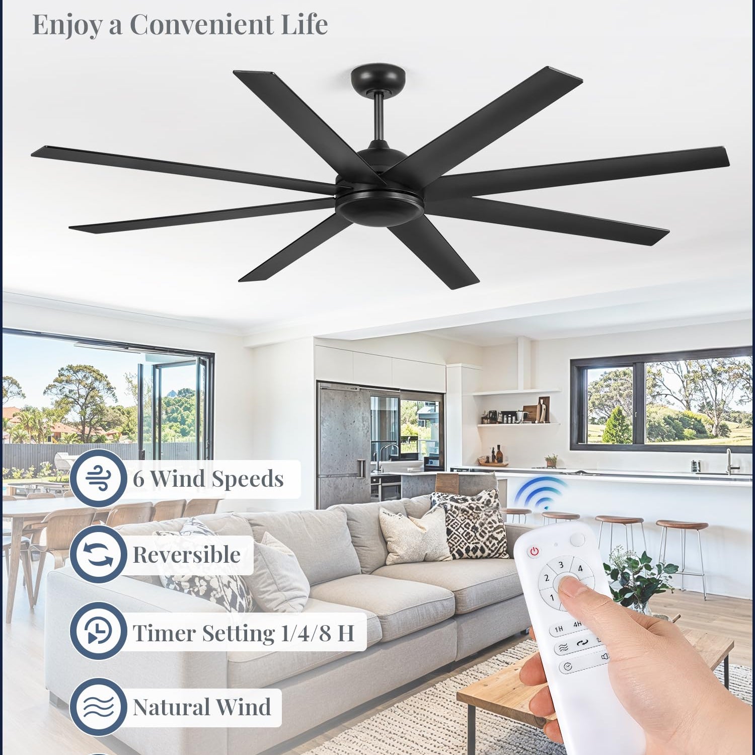 72 Inch Ceiling Fan no Light, Black Ceiling Fan with Remote, 6-Speeds, Quiet Reversible DC Motor, Industrial Ceiling Fans without Lights for Living Room, Garage, Patio, Indoor/Outdoor Use