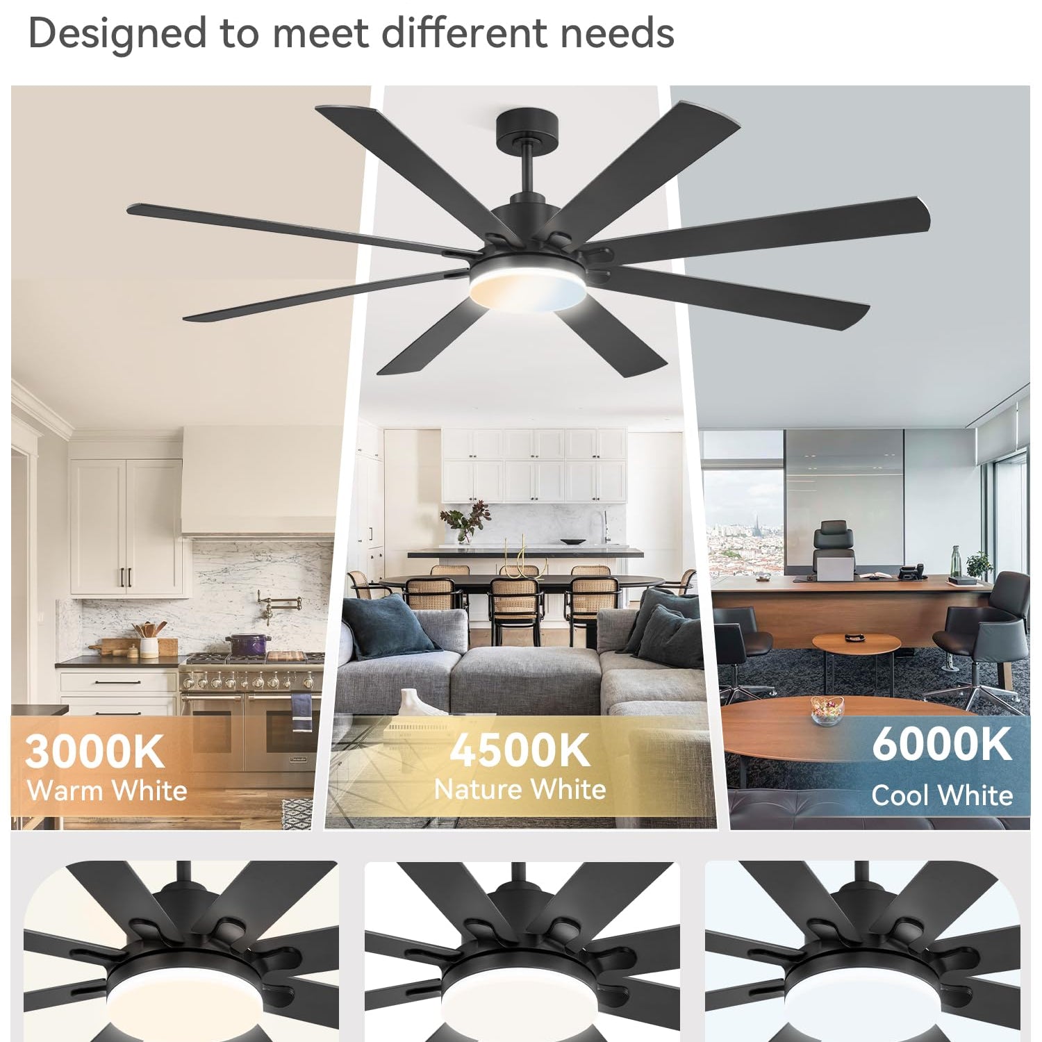 - Larger Illuminated Area and Brighter LED Light: Our LED Panel is 10.68 inches, providing a wider illuminated area and ensuring ample light in every corner. With a 2400LM brightness, the lighting effect is brighter than other 72-inch ceiling fans. And Long hours of reading or working won't cause eye strain. At the same time, this ceiling light with fan offers three adjustable color temperatures (3000K/4500K/6000K) to suit various lighting needs.