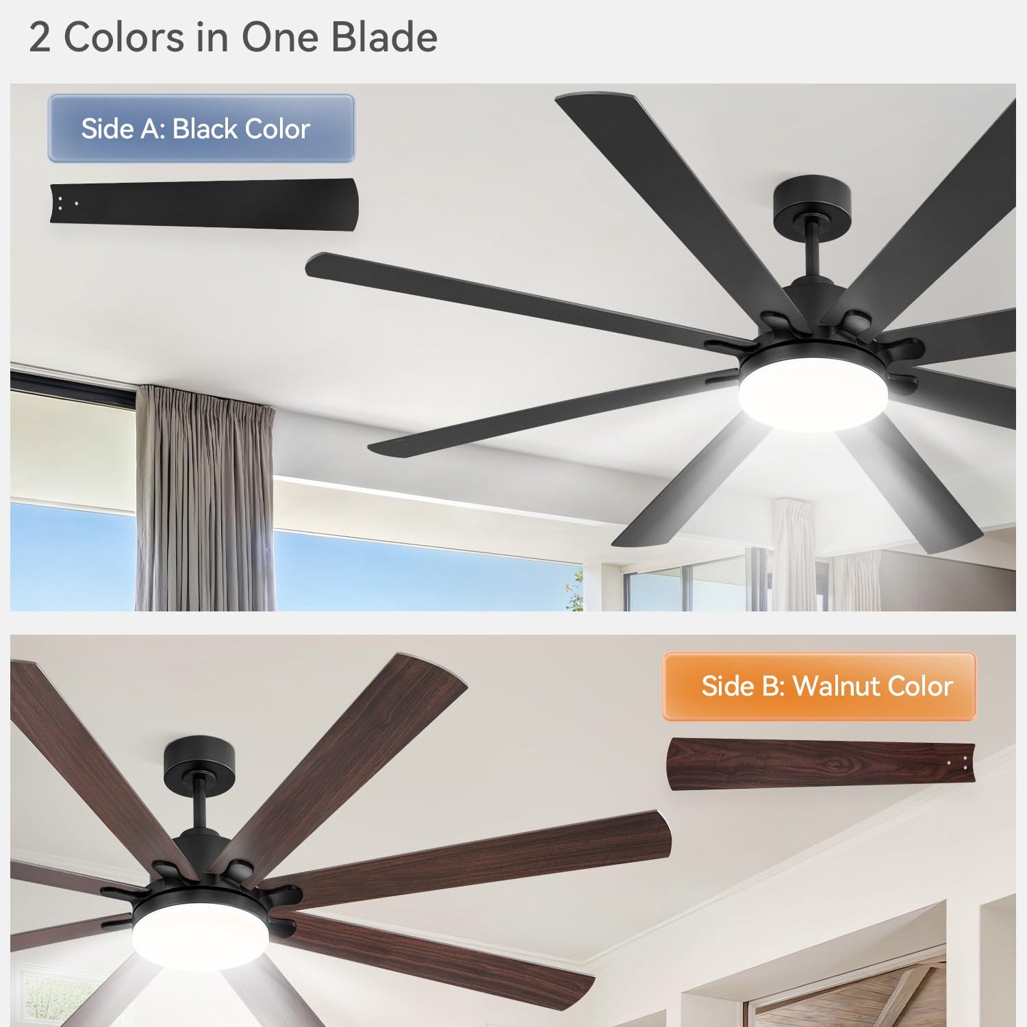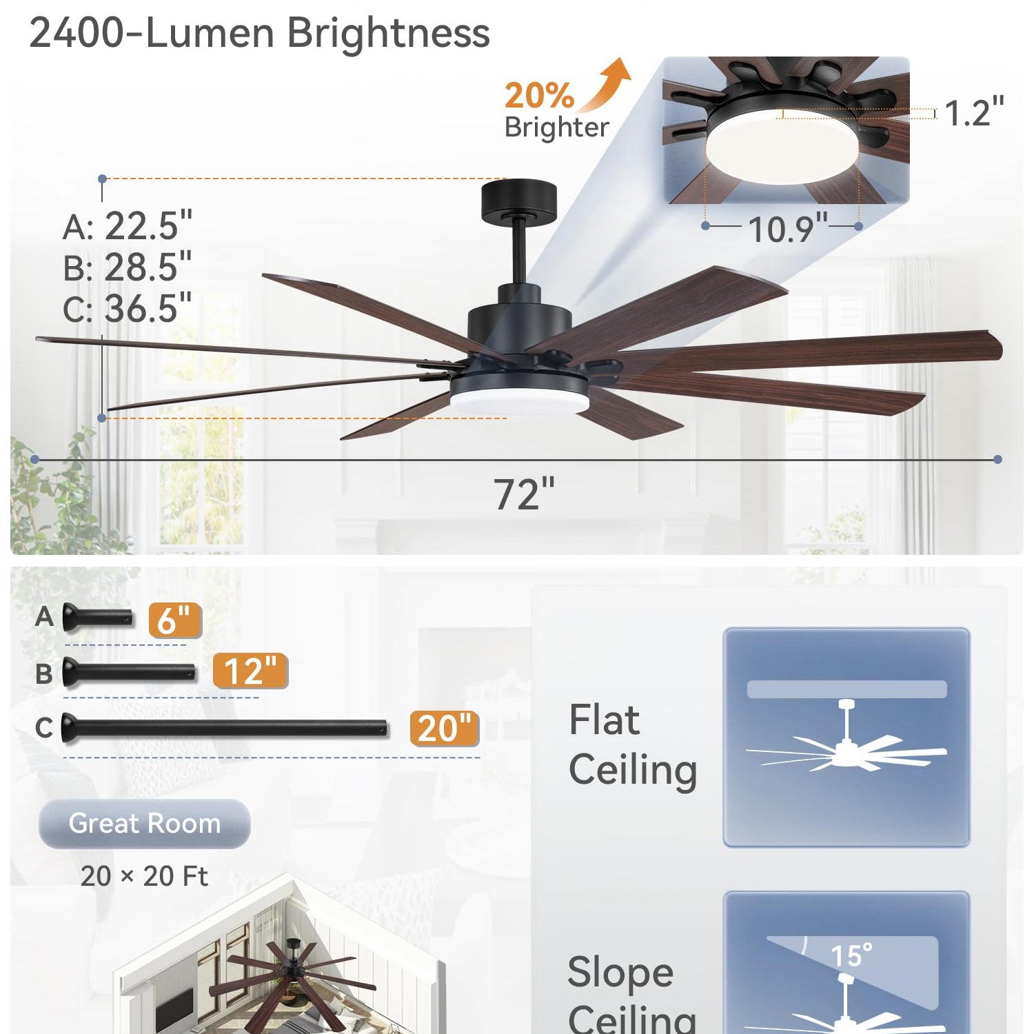 - Large ceiling fan: This 72-inch large fan is designed to meet the needs of spacious areas. Our black ceiling fan comes with dual-sided blades in black and walnut colors. You can choose different colored blades based on your home style and holidays. Equipped with 6/12/20-inch downrods, this ceiling fan is suitable for high ceilings and low ceilings. Additionally, this fan supports installation on a 15° sloped ceiling.