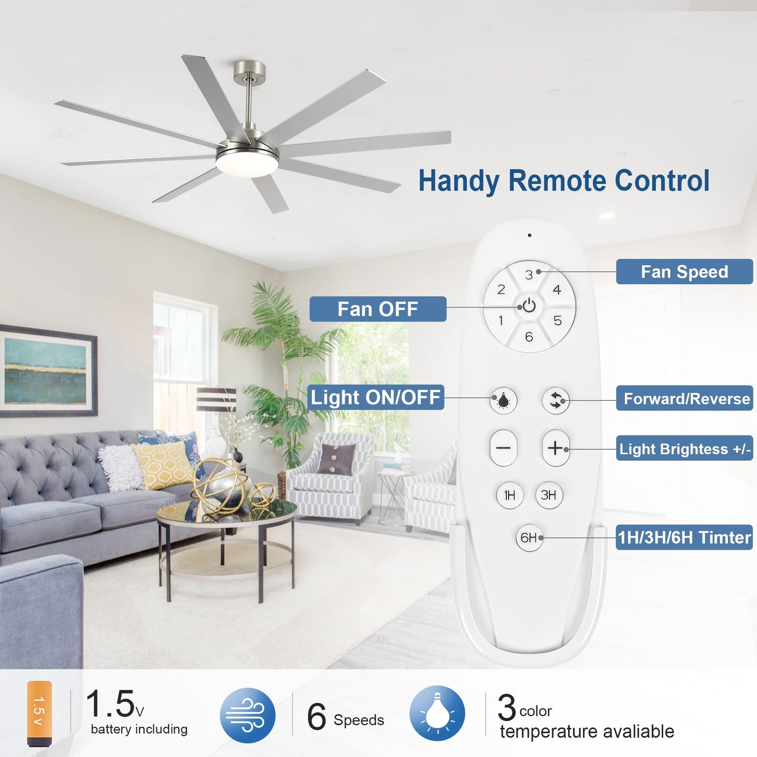 72 Inch Large Ceiling Fans with Lights and Remote, Modern Brushed Nickel Ceiling Fan for Indoor or Outdoor Patio, 6 Speed, Reversible, DC Motor, Timer, 3 CCT, Dimmable