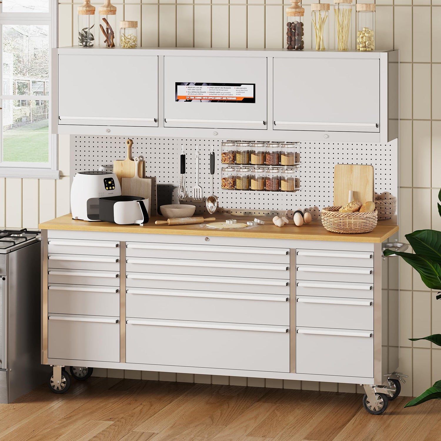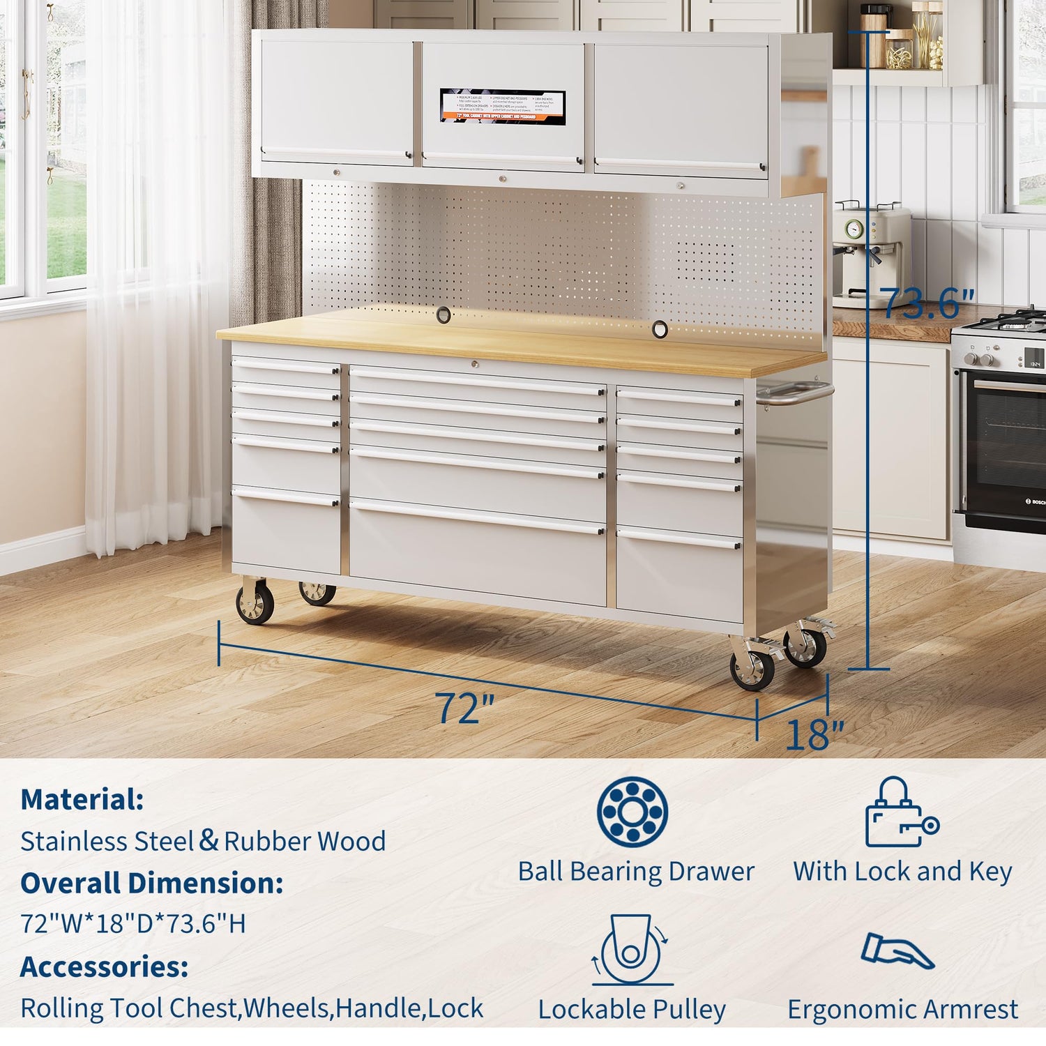 72 inch Rolling Tool Chest, Garage Workbench with 15 Drawers, Solid Rubber Wood Top & with Wheels Lock Key Locking, Mobile Workstation Tool Cabinet for Workshop Storage