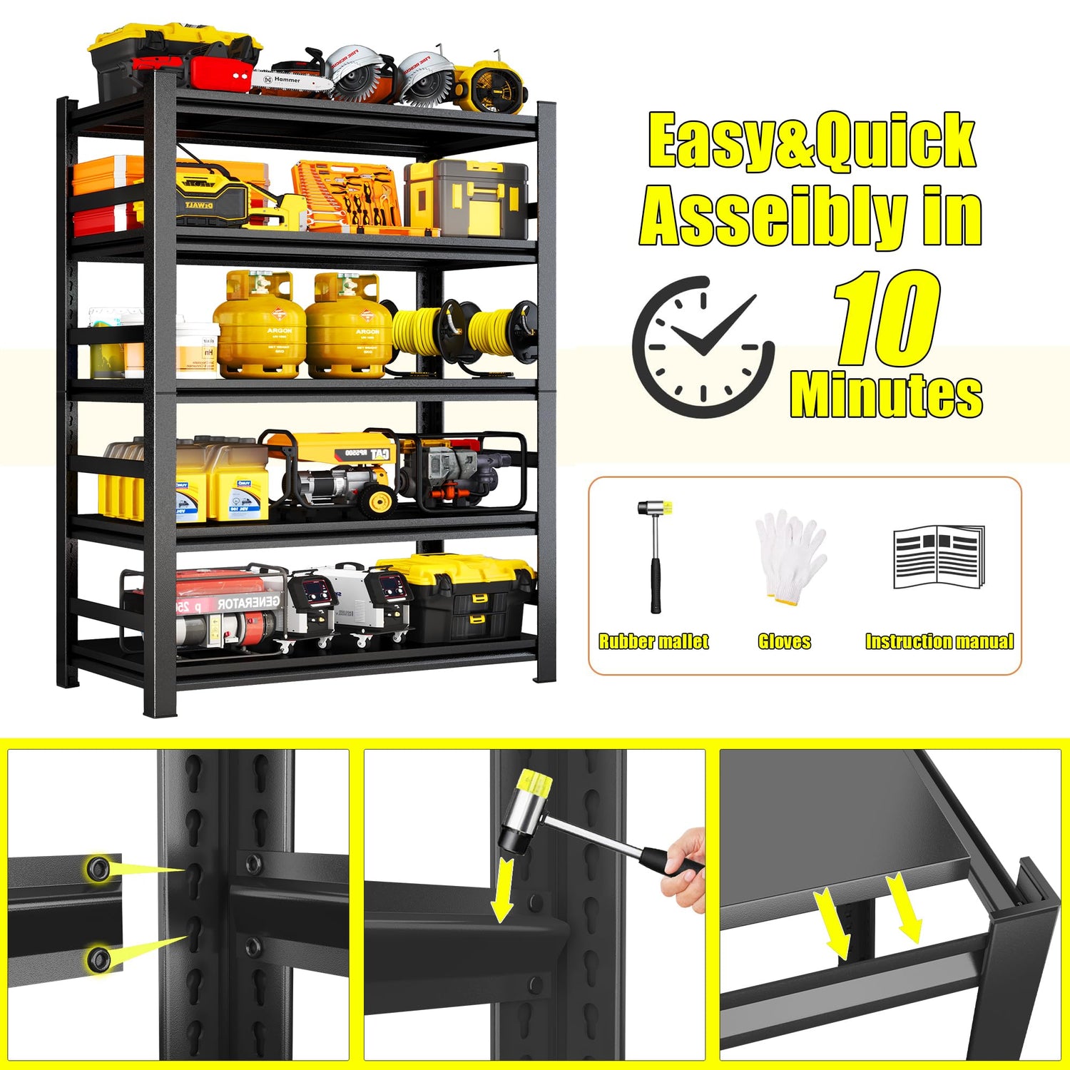 - Easy Assembly & Thoughtful Service: This metal garage shelving features a unique bolt-free slot design, allowing for quick and convenient installation. To help you assemble it rapidly, we're offering a free rubber mallet and a pair of gloves. Even if you're not a DIY enthusiast, you can finish the assembly in a short time, creating a practical and time-saving storage solution. Meanwhile, the product comes with a detailed instruction manual. If you have any questions about the product or find any parts damaged or missing, please feel free to contact us. Our professional customer service team will quickly resolve all your issues within 24 hours