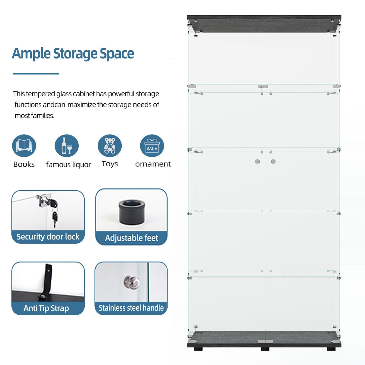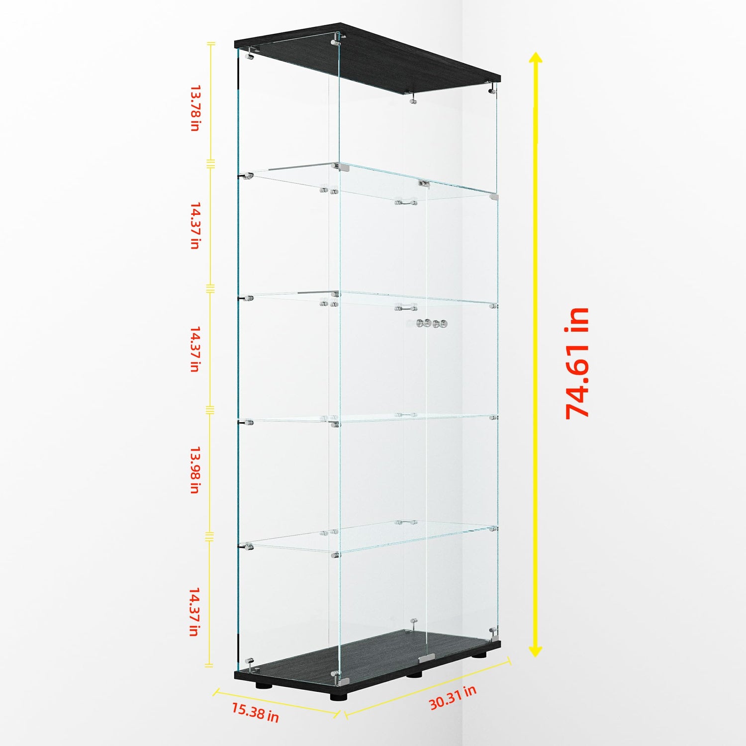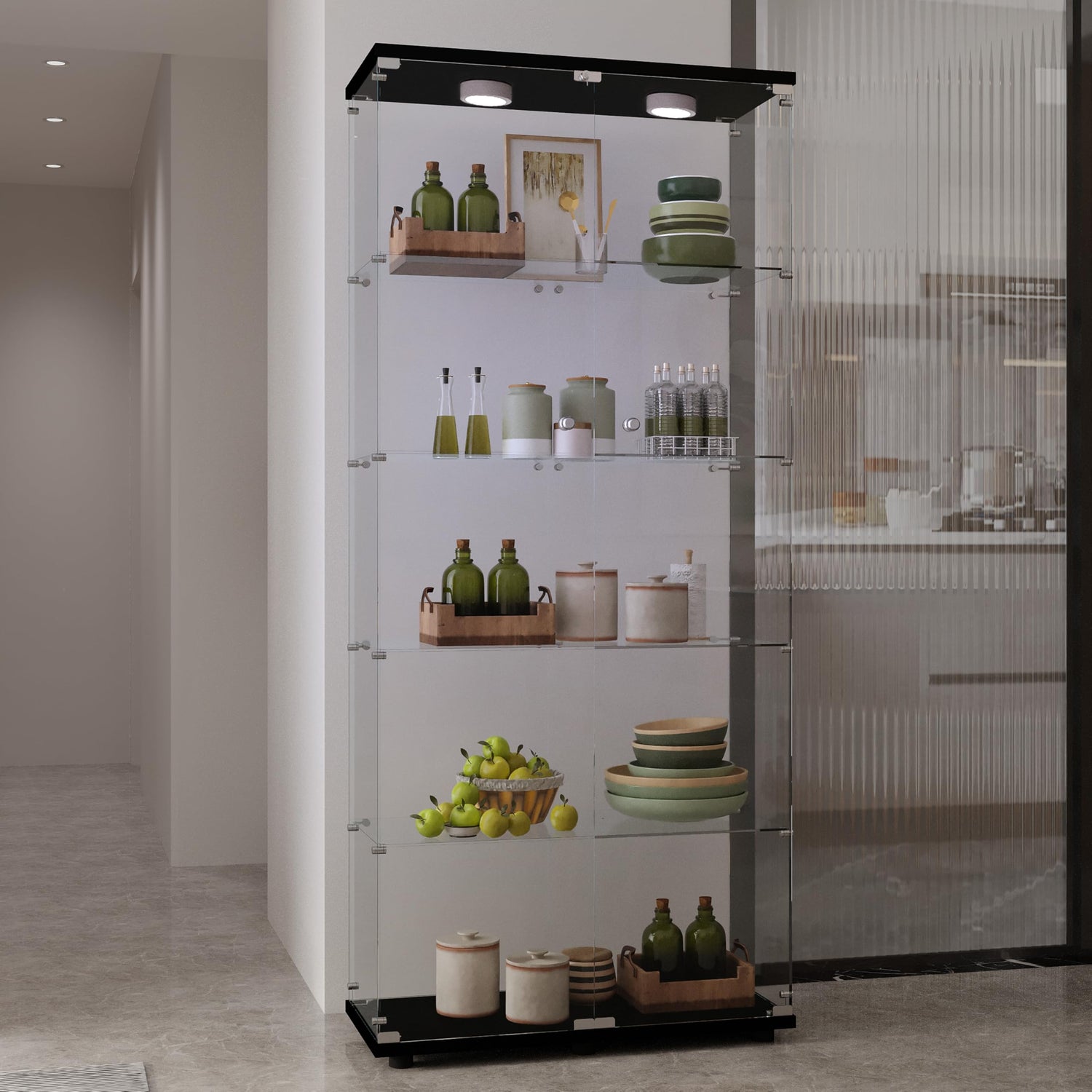 - LED Glass Display Cabinet: Size 74.8" (H) x30.91" (L) x13.58" (W) inches, 5-shelf design is sturdy and stylish to display photos, books, action figures, wine and whisky; glass door is easy to open and close.