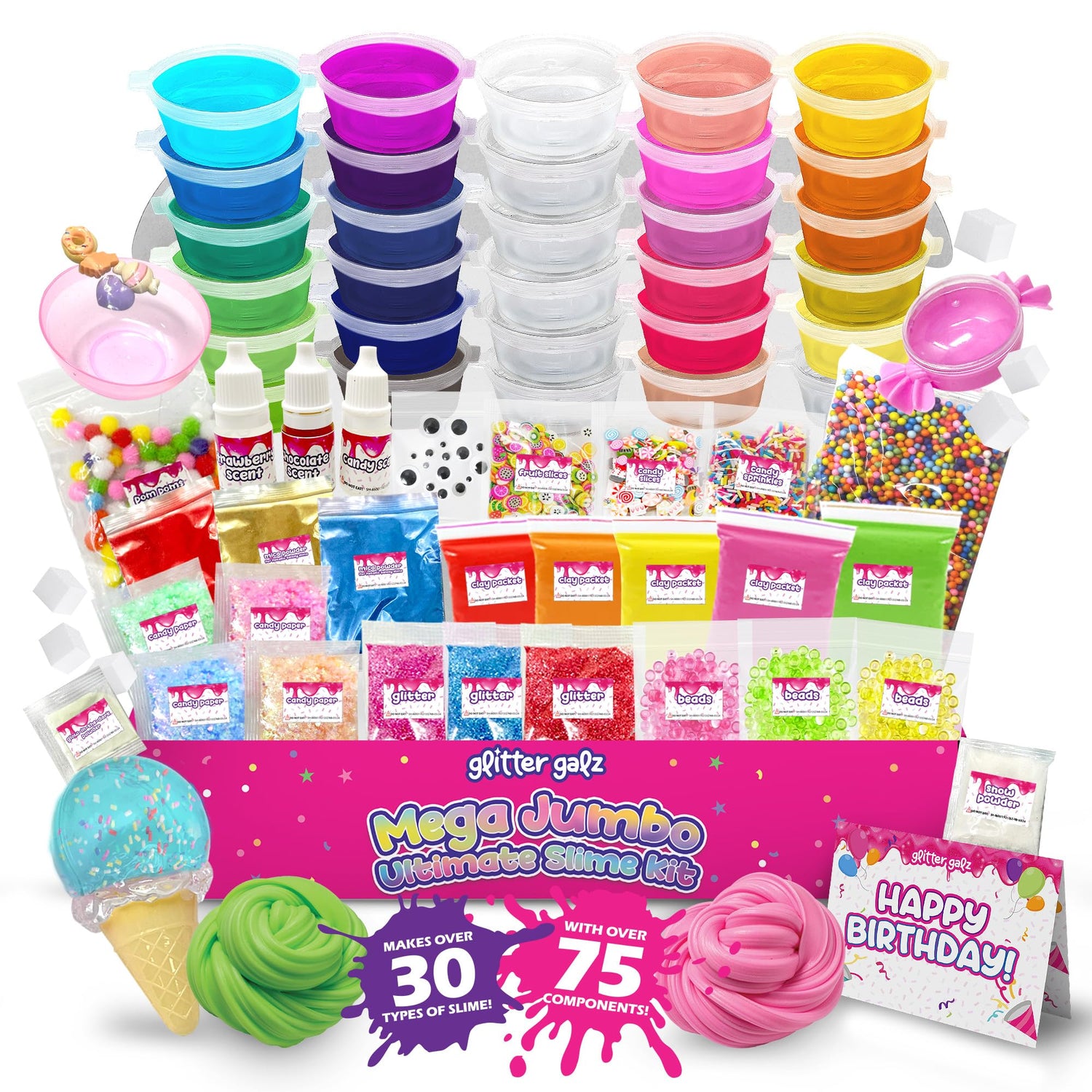 - Jumbo Fluffy Slime Kit Bucket - Glitter Galz slime maker contains over 75 components—30 different color ready-made slimes, 3 molds, 2 snow and glow-in-the-dark powder, 2 fruit and candy slices, 5 clay packets, 2 foam balls, 3 fishbowl beads, 4 candy papers, 3 mica powder, accessories and more!