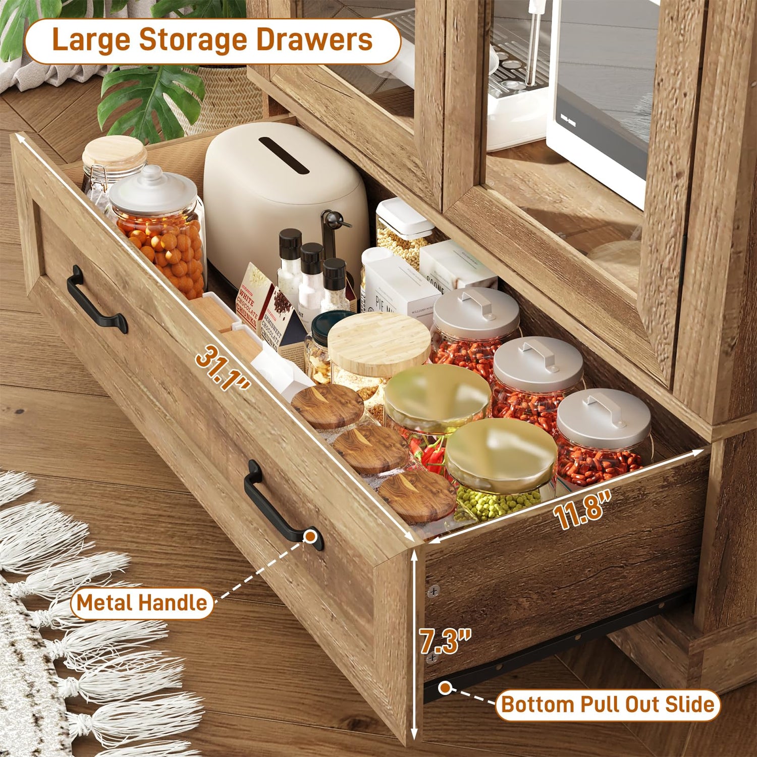 - Stable Structural: This farmhouse wood storage cabinet is made of Sturdy P2 engineered wood and metal,Fully floor-standing solid base,that is steadfast and wobble-free,able to withstand the challenges of long-term use.Anti-tilt device on the back of the top baord.Featuring open large drawers, and closed compartments, this vaulted pantry cabinet offers ample space for all your essentials.